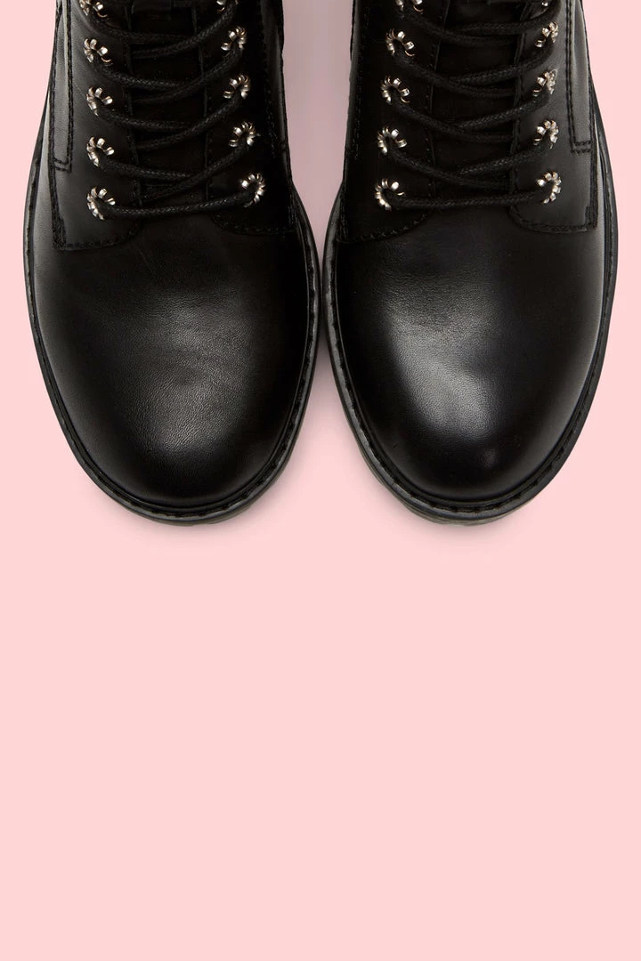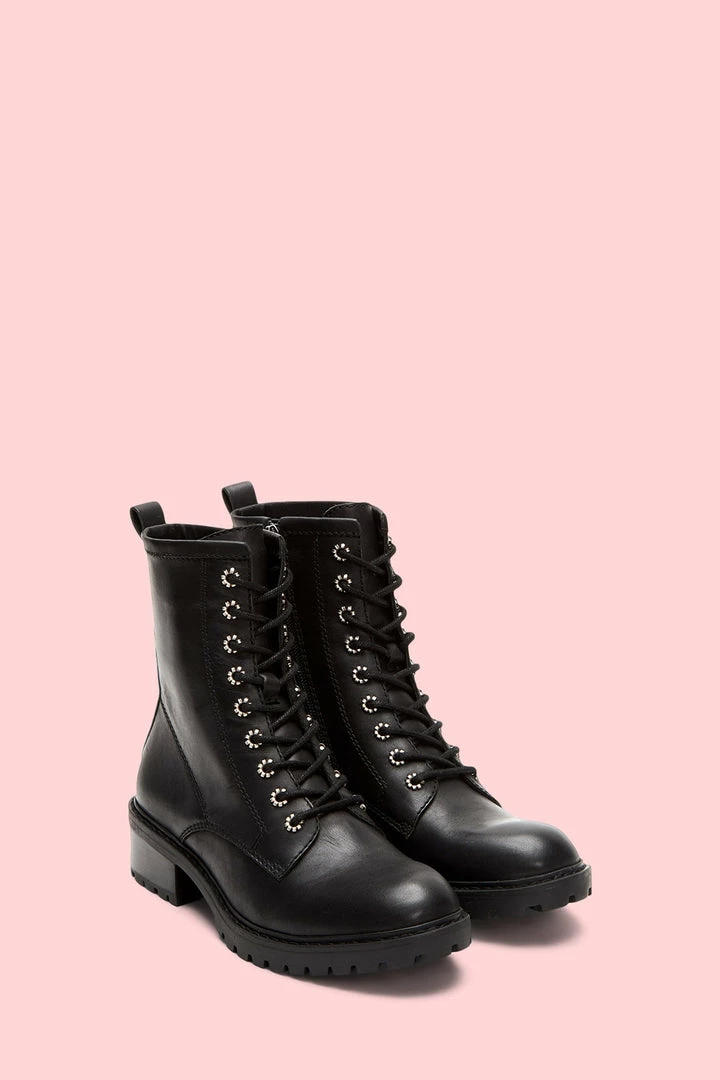 These boots are modeled after traditional combat shoes. Made from waxed leather, they’re set on lugged rubber soles with leather wrapped heels and simply detailed with antiqued star eyelets at the lace-up closure. Inside zip ensures comfortable ease.– Cotton twill lined
