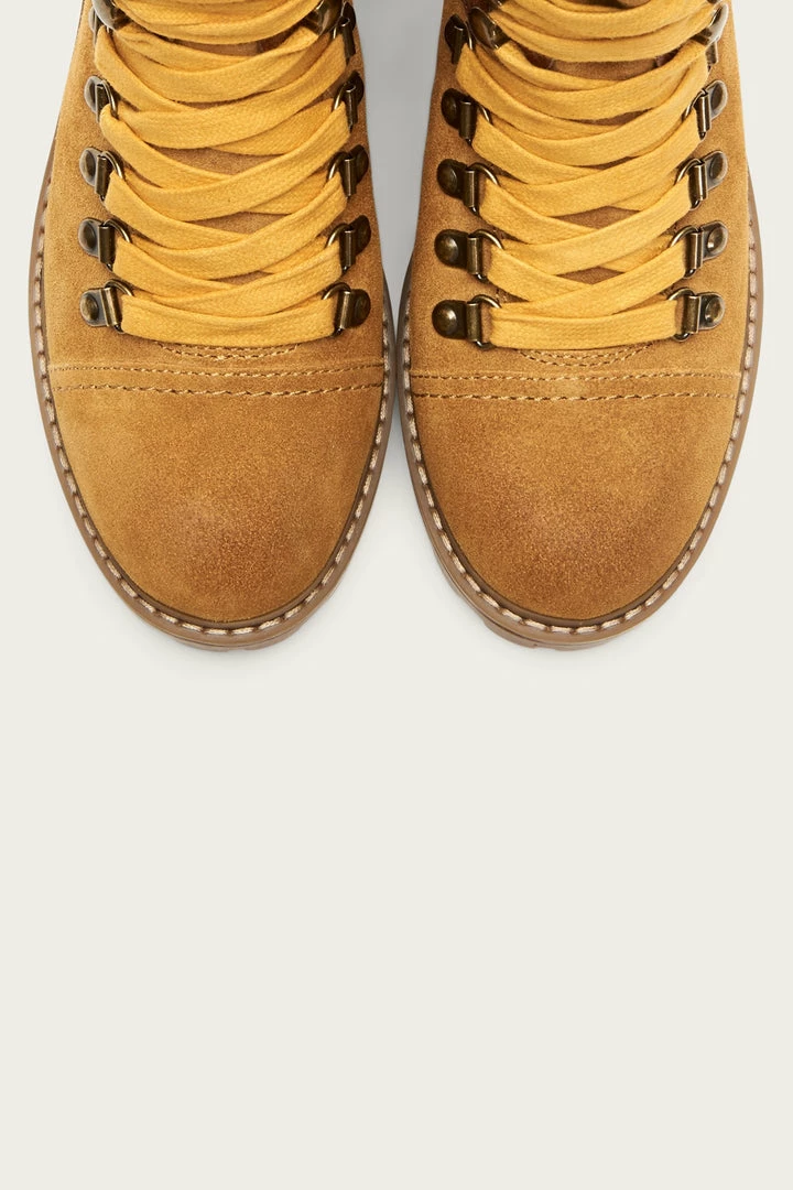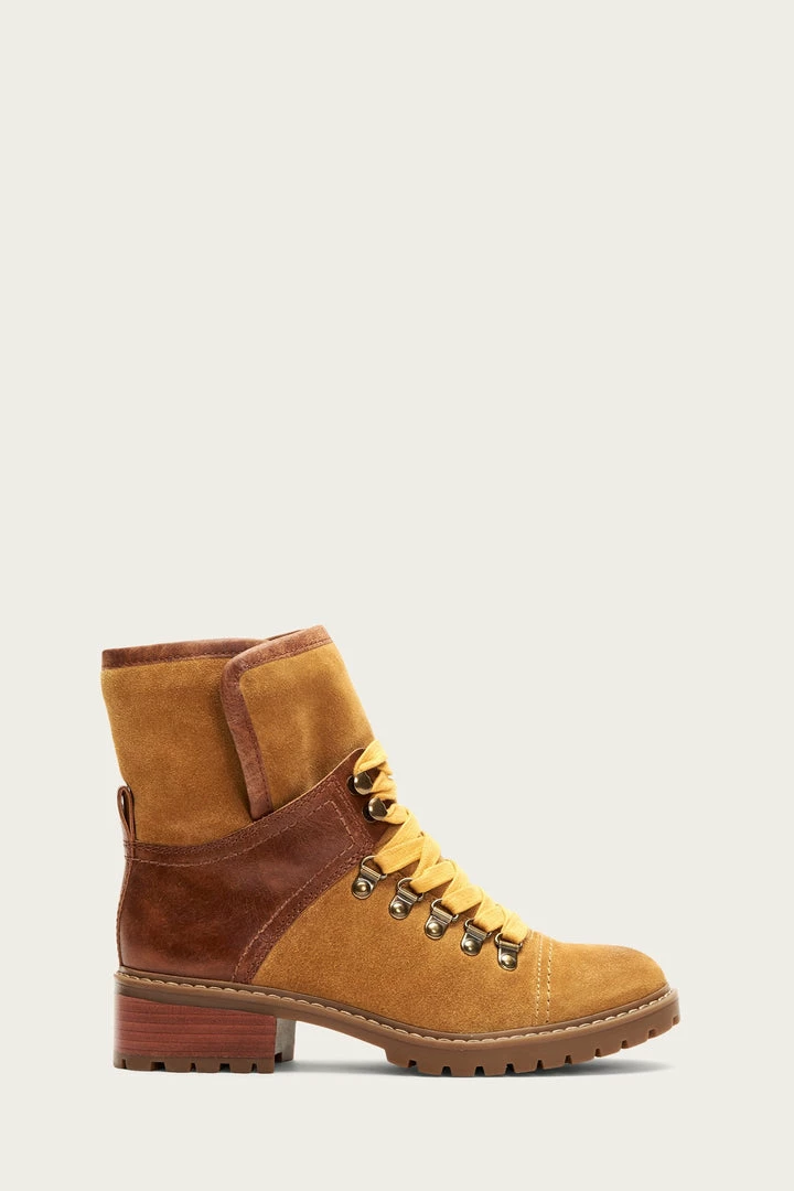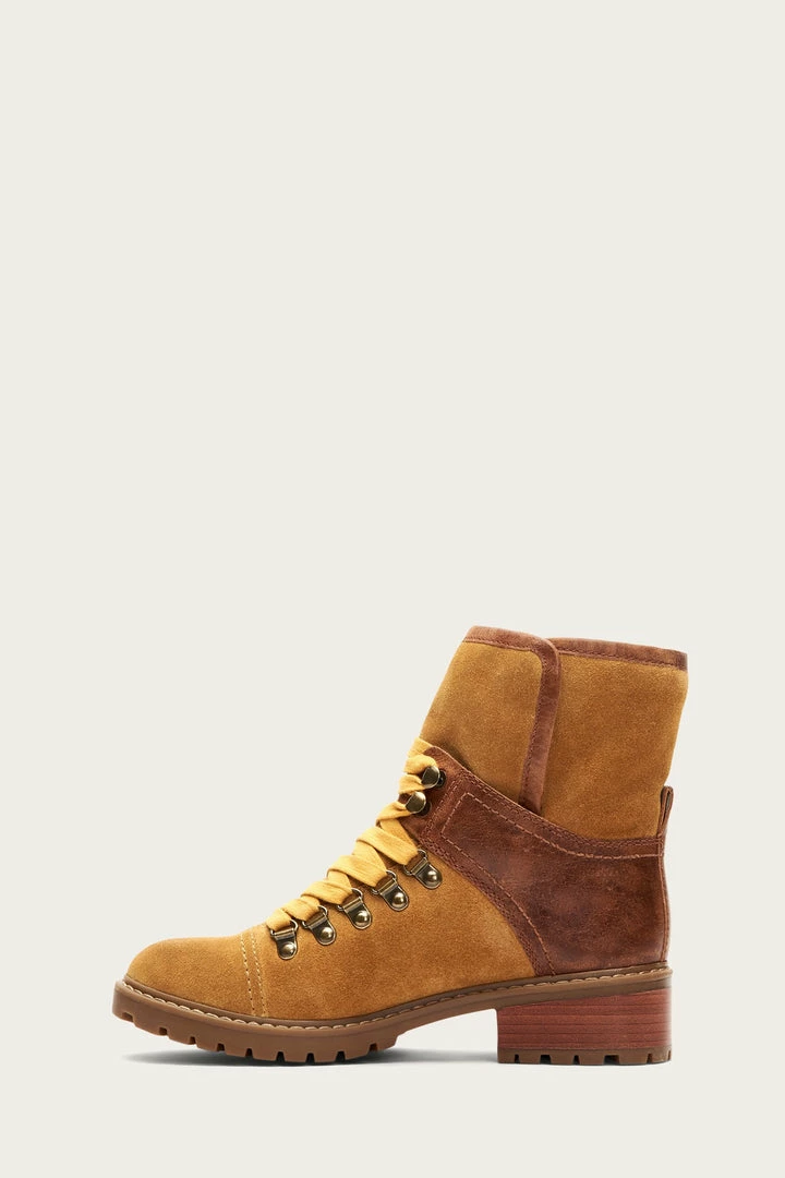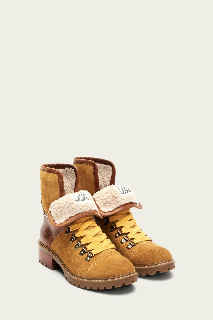 Get ahead of the trend with a hiking boot style. Made from supple suede and smooth leather, this pair rests on rubber lug soles with leather wrapped heels. They have traditional eyelet and speed hook lace-up closures. – Shearling lined