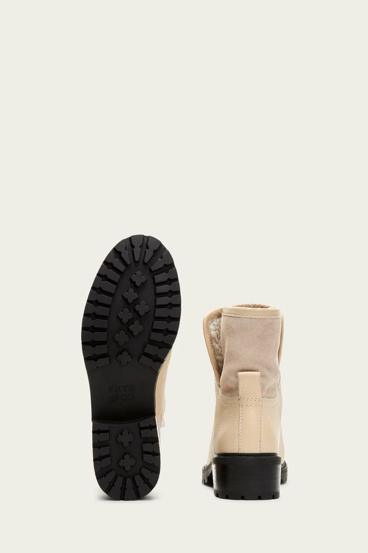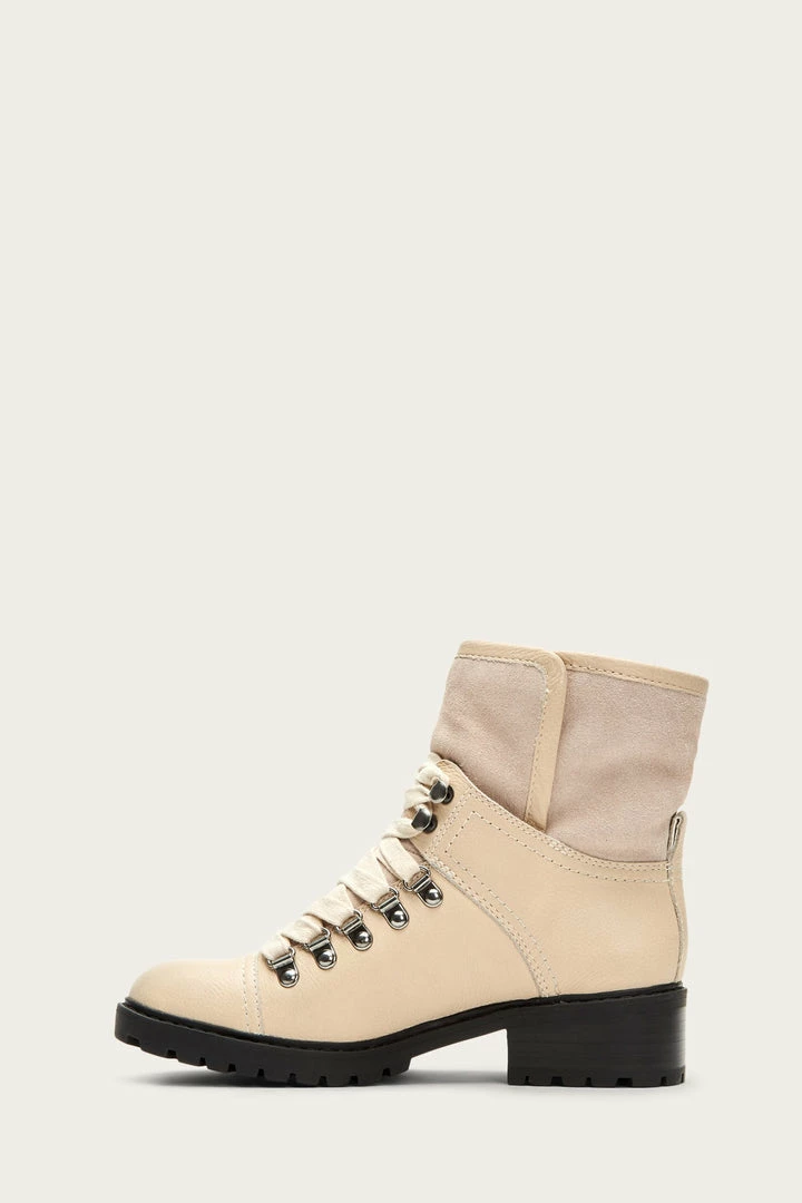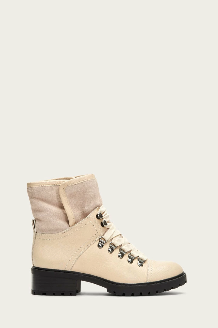 Find any excuse to go on walks with this snug pair of hiking inspired booties.The upper mixes suede, waxed leather and soft faux shearling lining resting on rubber lug soles with leather wrapped heels. The speed hook closures make them a cinch to lace. – Shearling lined