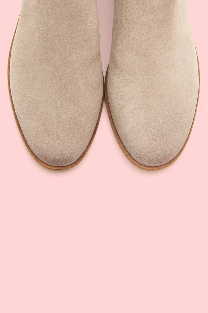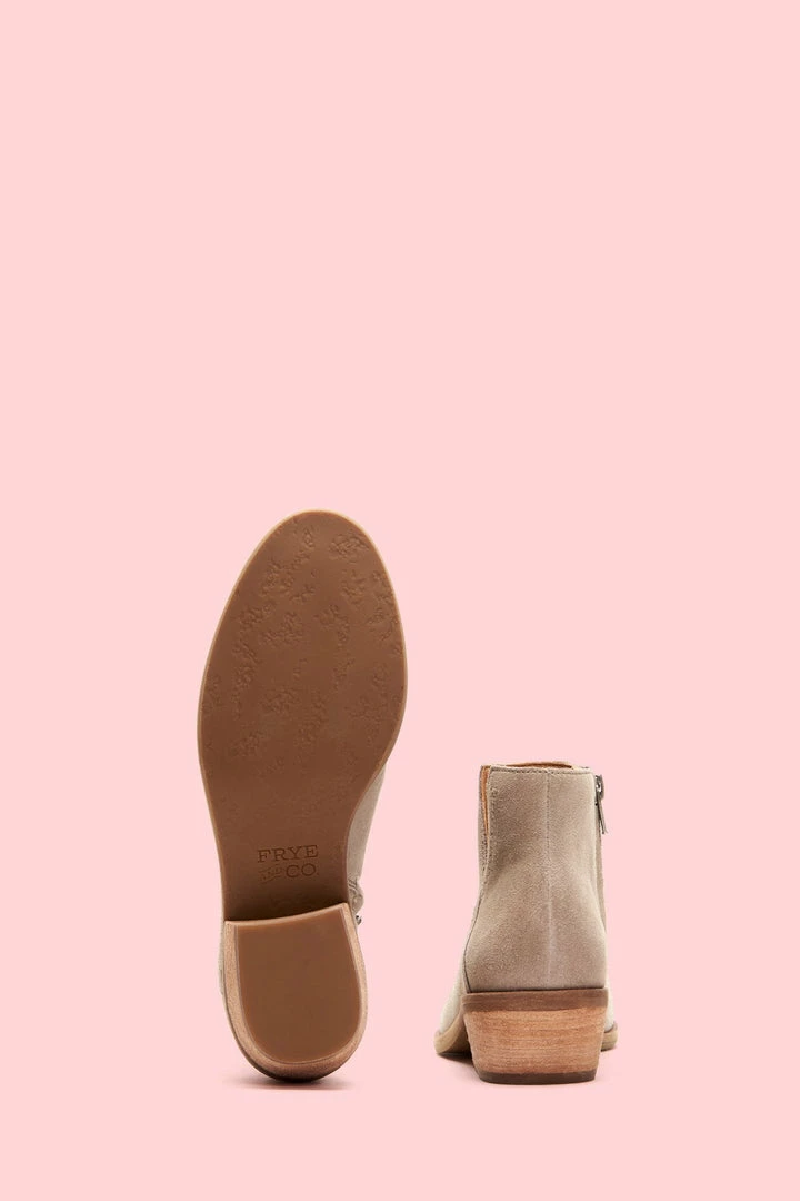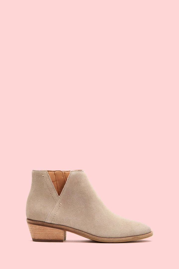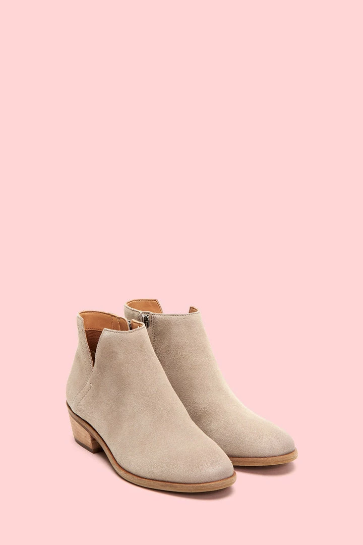 Everyday style with a Western attitude. Handmade from ultra-soft suede, this bootie stands out with its cutout side and rounded toe. Perfect for any warm weather adventure, wear it with or without socks for a kicked-back vibe. Set on a leather-wrapped heel, it features a convenient back zip. The flexible outsole in recycled leather offers long-lasting comfort every step of the way.