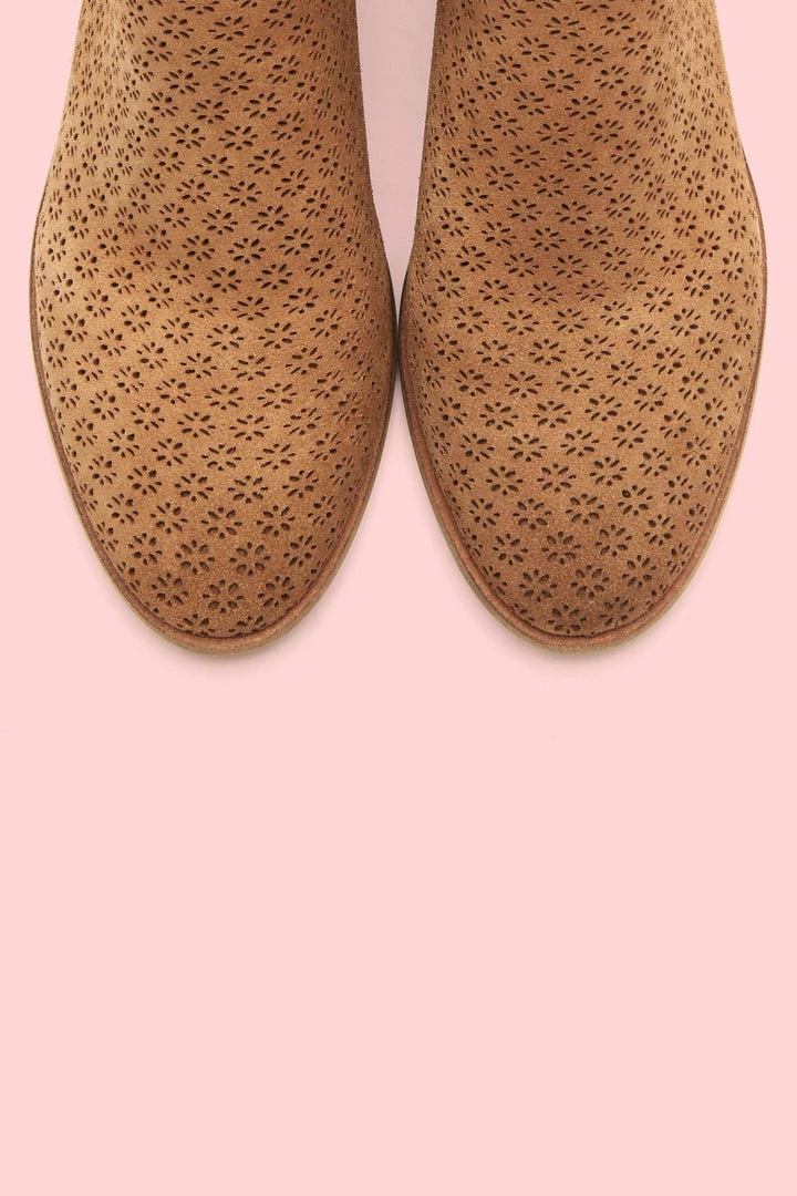 A feminine take on Western attitude. Handmade from s ultra-soft suede, this bootie stands out with its cutout side, perforation and rounded toe. Perfect for any warm weather adventure, wear it with or without socks for a kicked-back vibe. Set on a leather-wrapped heel, it features a convenient back zip. The flexible outsole in recycled leather offers long-lasting comfort every step of the way.