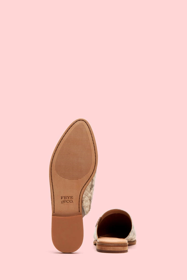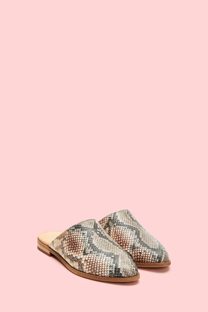 An artisanal take on the classic mule. Crafted from snake-embossed leather, this mule stands out with its hand-stitching and modern almond toe. Easy and effortless, it has an inside gore for that perfect fit. The recycled wood heel anchored by recycled leather welt and sturdy outsole offer comfort from a sustainable point of view.