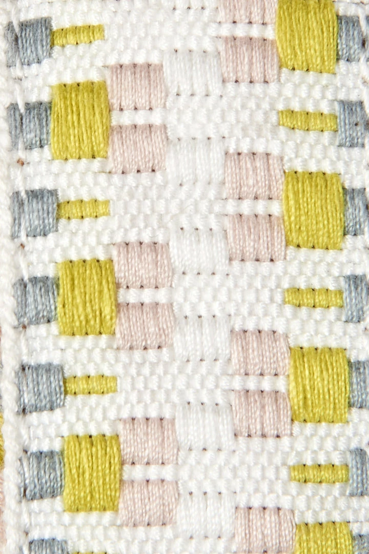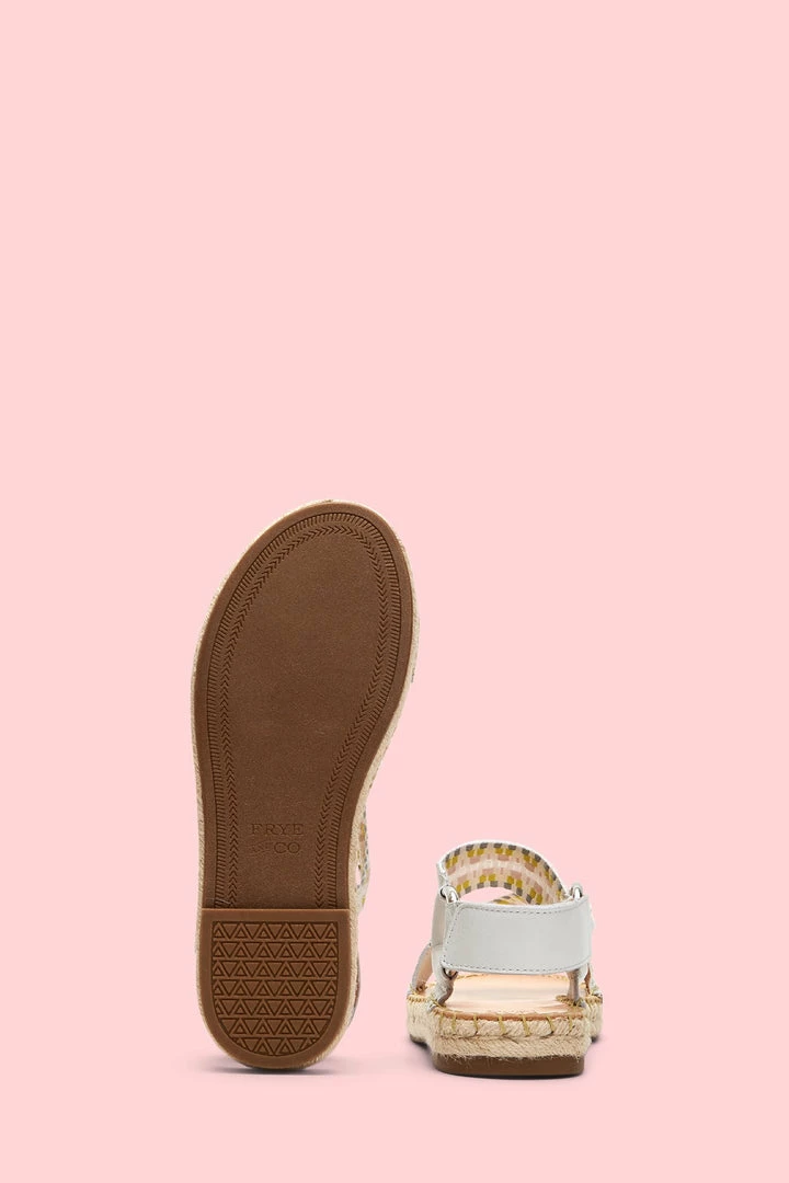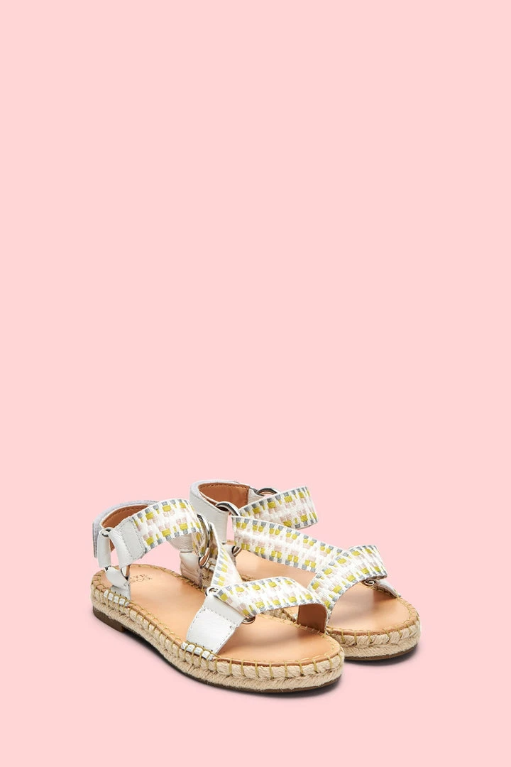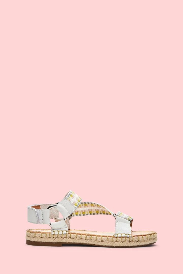 Sporty chic with a twist. Made from a mix of tumbled buffalo leather and geometric webbing, this asymmetrical sandal boasts a boho vibe for summer days and nights. Set on an espadrille sole, it boasts accents including bold blanket stitch detailing and the iconic harness ring. Ultra-comfortable footbeds and easy Velcro back strap deliver that effortless vacation vibe, no matter where you wear it. – Man made lining