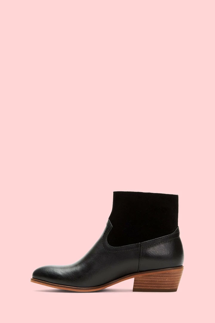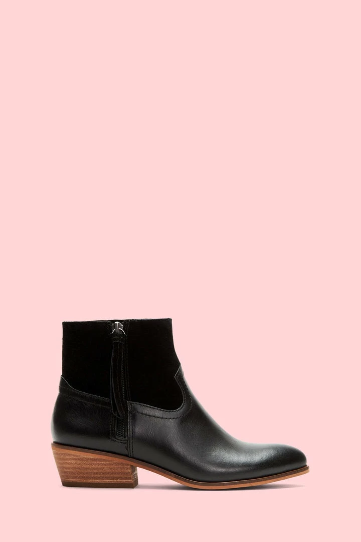 A moto influenced take on a Western style, this pair of booties have been crafted from soft suede and smooth leather and set on leather wrapped heels. – Unlined shaft