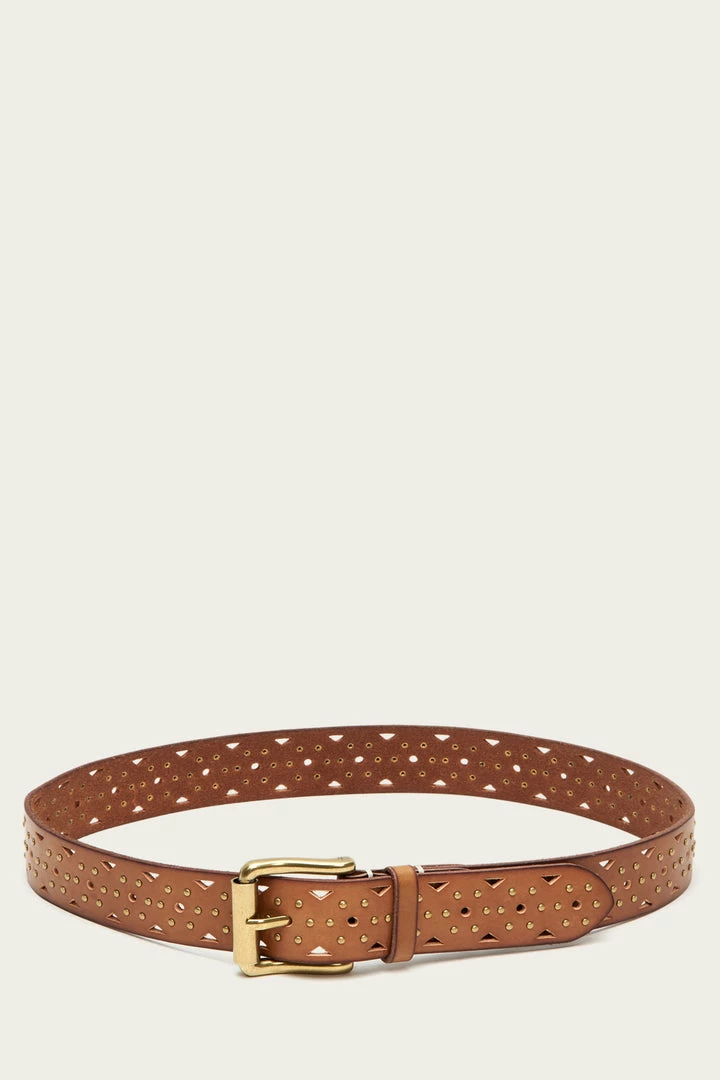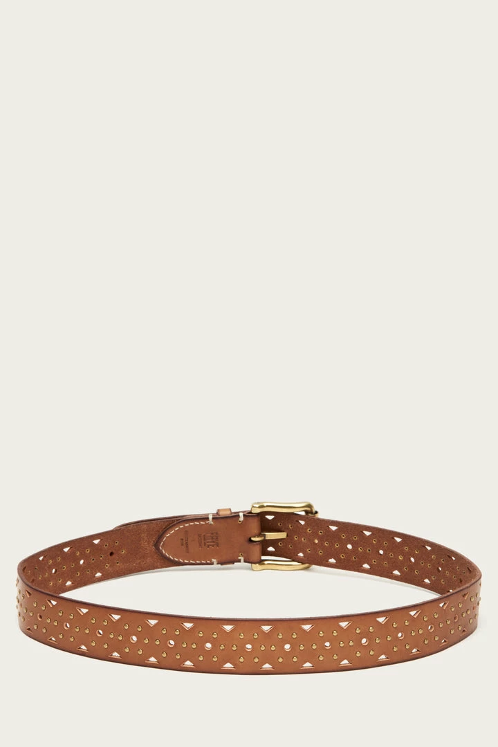 Belts are a key trend this season. Made from the finest leather, this 38mm wide style is embellished with scores of hand-applied studs in a signature perforated look. Adjustable buckle closure.