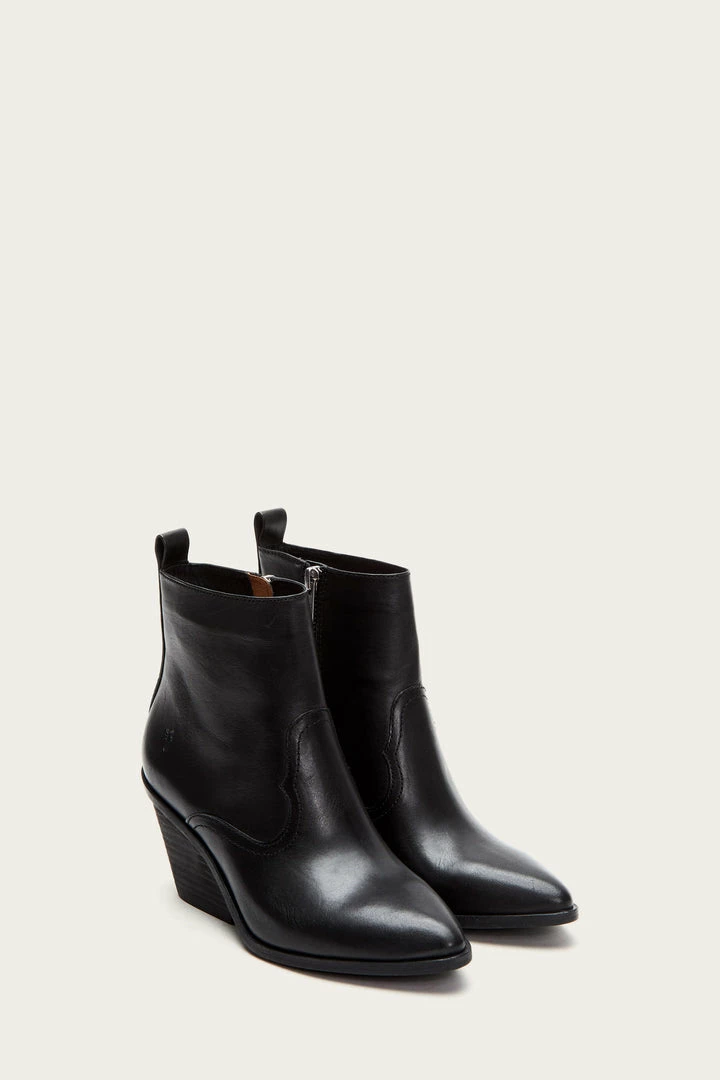 Crafted from antiqued vegetable-tanned leather, this pair of booties has sleek pointed toes and a Wellington stitch giving them a Western feel. Modernized with an inside zipper closure and a height defining wedge heel. – Leather lined