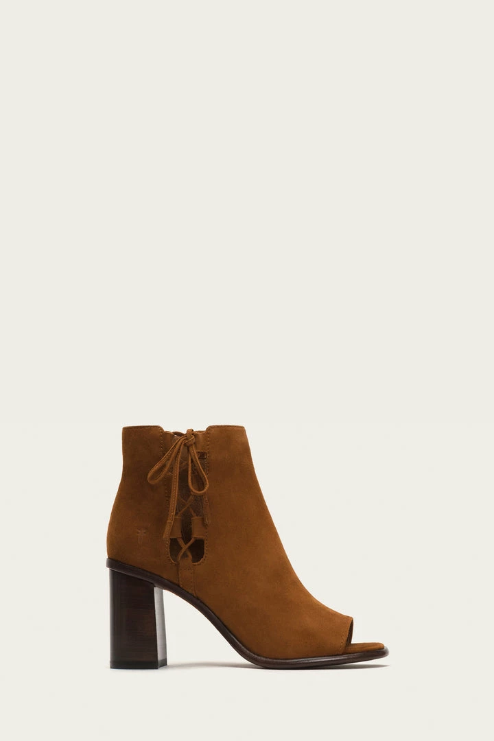 The warm-weather ready open-toe bootie constructed from elegantly refined soft kid suede has been updated with a ghillie self-tie lace-up detail at the exterior sides. Finished with a mid-heel and an inside zip closure for chic ease. – Leather lined