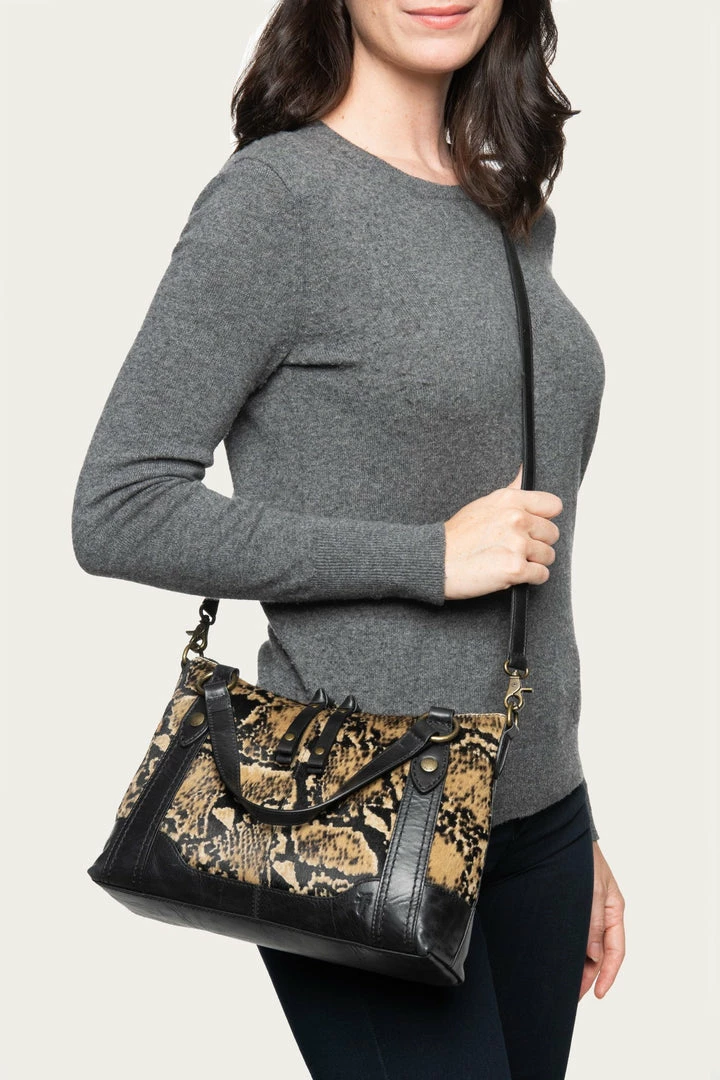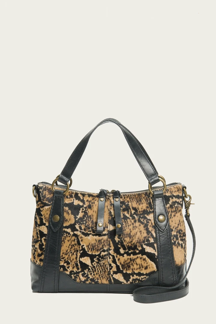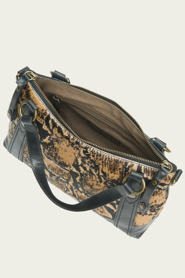 – Medium sized zip crossbody bag with snake printed haircalf and leather trim. Featuring removable, adjustable leather strap, dual handles, and dual zippers