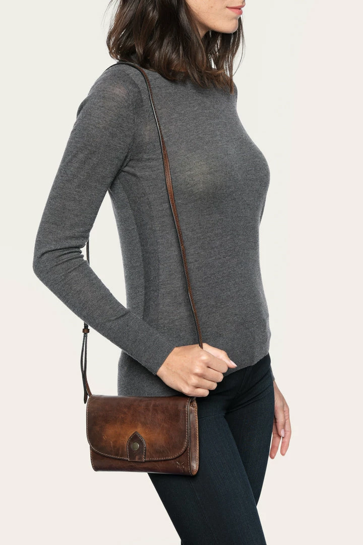 The brand’s penchant for ’70s detailing remains on point with the Melissa wallet crossbody style. Made from an antiqued pull up leather and minimally detailed with a designer button detail at the flap front that makes for a subtle update to Western-inspired look.