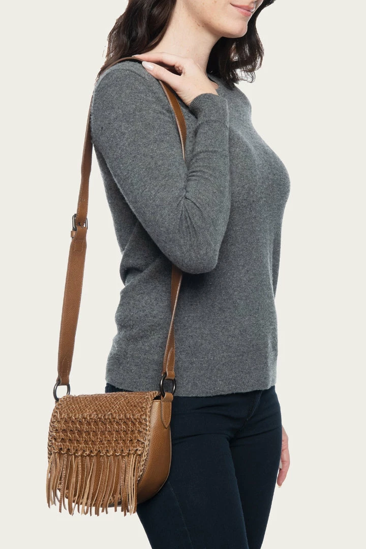 – Woven saddle crossbody bag with removable, adjustable leather strap, magnetic closure and fringe detail