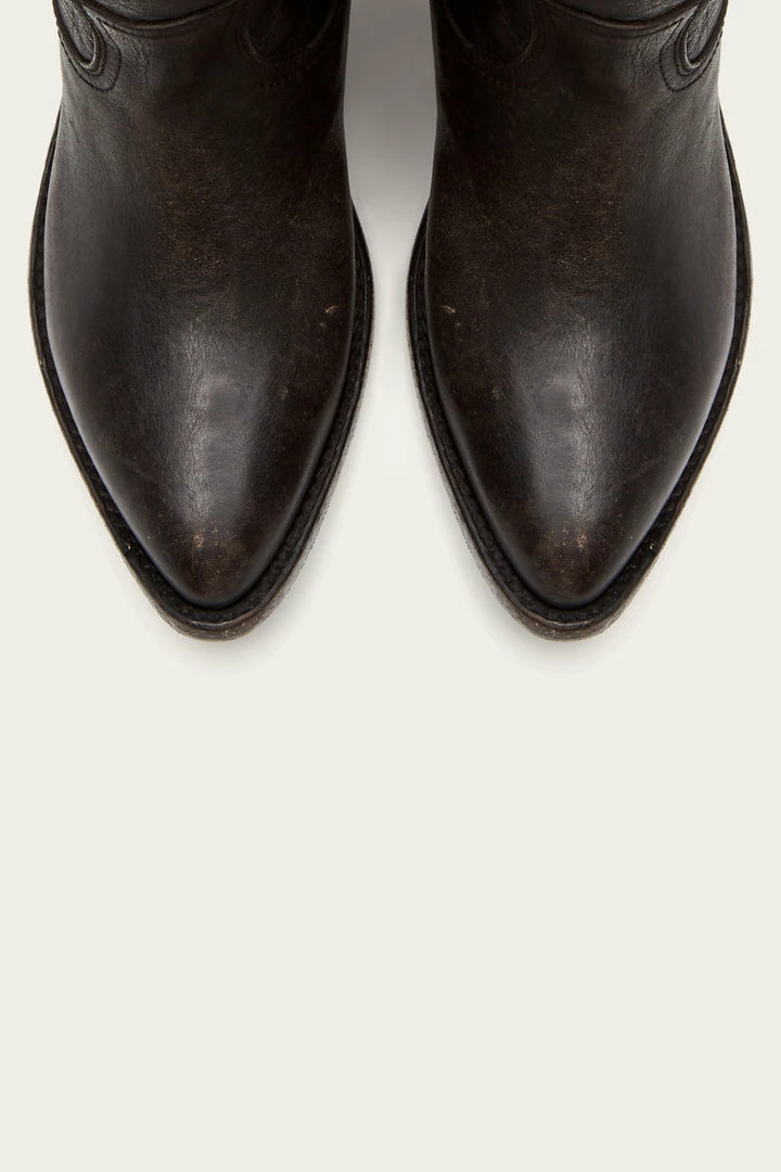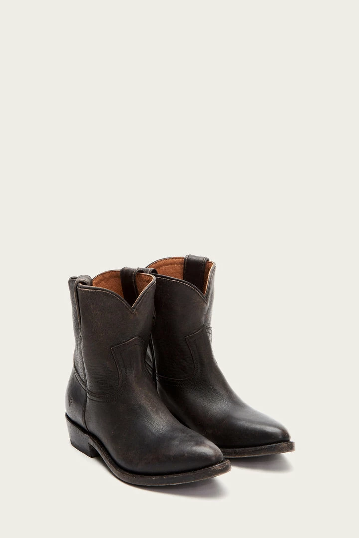 Footwear has taken a turn due West, so if you’re ready to fully embrace cowboy styles, consider the short Billy boots. Made from brush off metallic leather, this pair has a pointy toe and pitched heel.