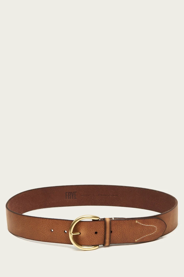 This 40mm wide belt is a must-have for fans of the iconic brand. This style is crafted from smooth leather and embellished with a signature brass buckle that has a slightly burnished finish. Stitch detail at tip.