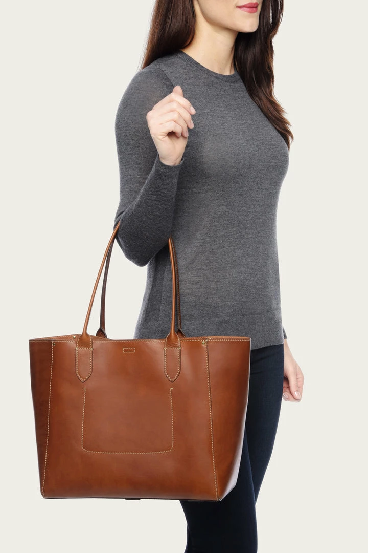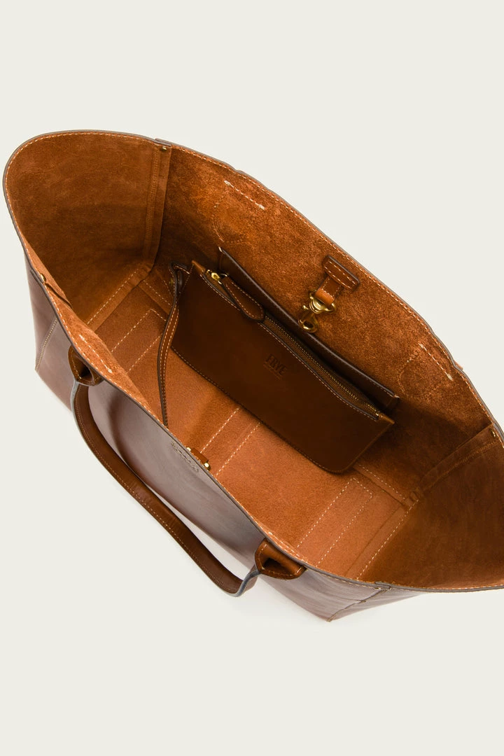 This tote is all about the leather. One of Italy’s finest, the leather is burnished and gets even better with wear. Unlined for an all-natural look, this east/west tote features a sleek interior pocket for essentials as well as an attached pouch you can remove and take with you on-the-go. Leather feet prevent wear and tear while the interior swivel clip keeps belongings together and safe. Special touches include distinctive stitching and tiny riveted accents.