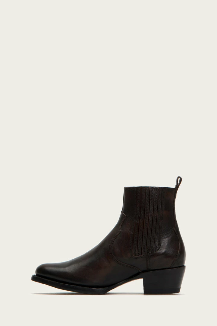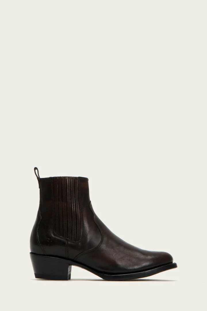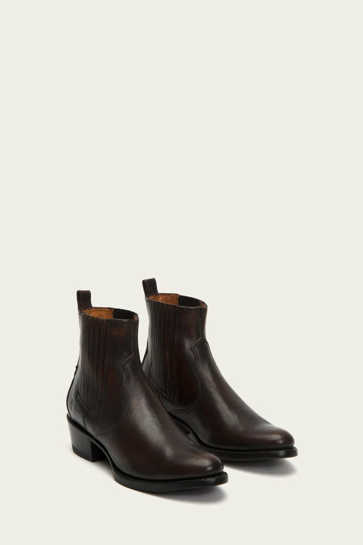 The almond toe Diana Chelsea boot combines a Western element on a classic full grain brush off Italian leather construction that easily transitions from the city to the country. The finger gore provides effortless pull-on style and the on-trend low mid-heel maintains the brands sophisticated aesthetic that only improves with wear. Goodyear welted finish. – Italian leather