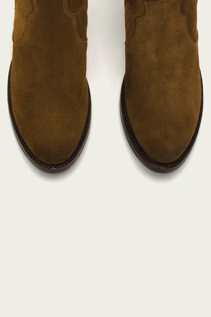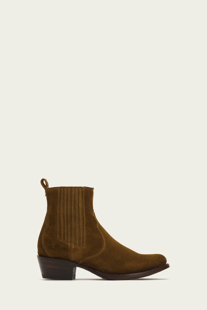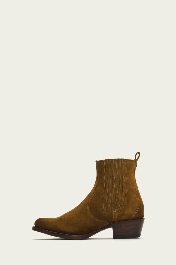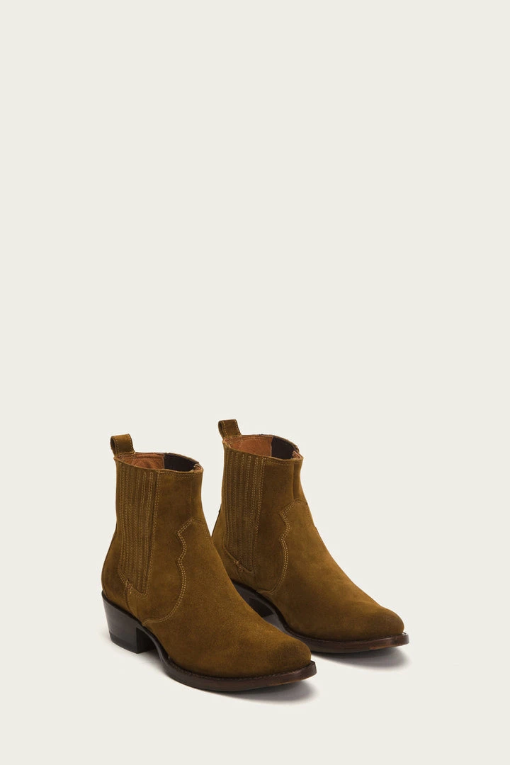 The almond toe Diana Chelsea boot combines a Western element on a classic soft oiled Italian suede construction that easily transitions from the city to the country. The finger gore provides effortless pull-on style and the on-trend low mid-heel maintains the brands sophisticated aesthetic that only improves with wear. Goodyear welted finish.