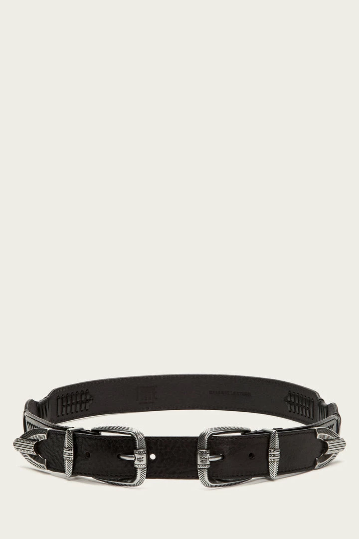 Behold the beauty of the buckle. Striking concho double-buckle hardware lends distinctive character to this textured leather belt with western metal tips and keepers.