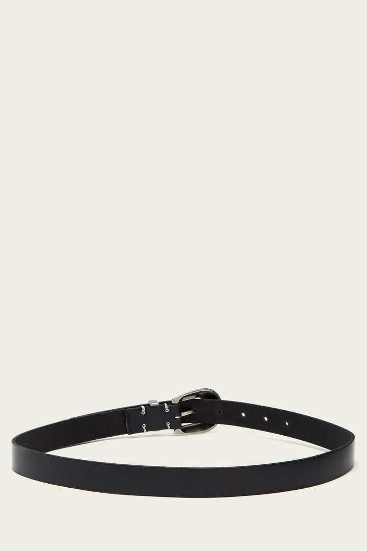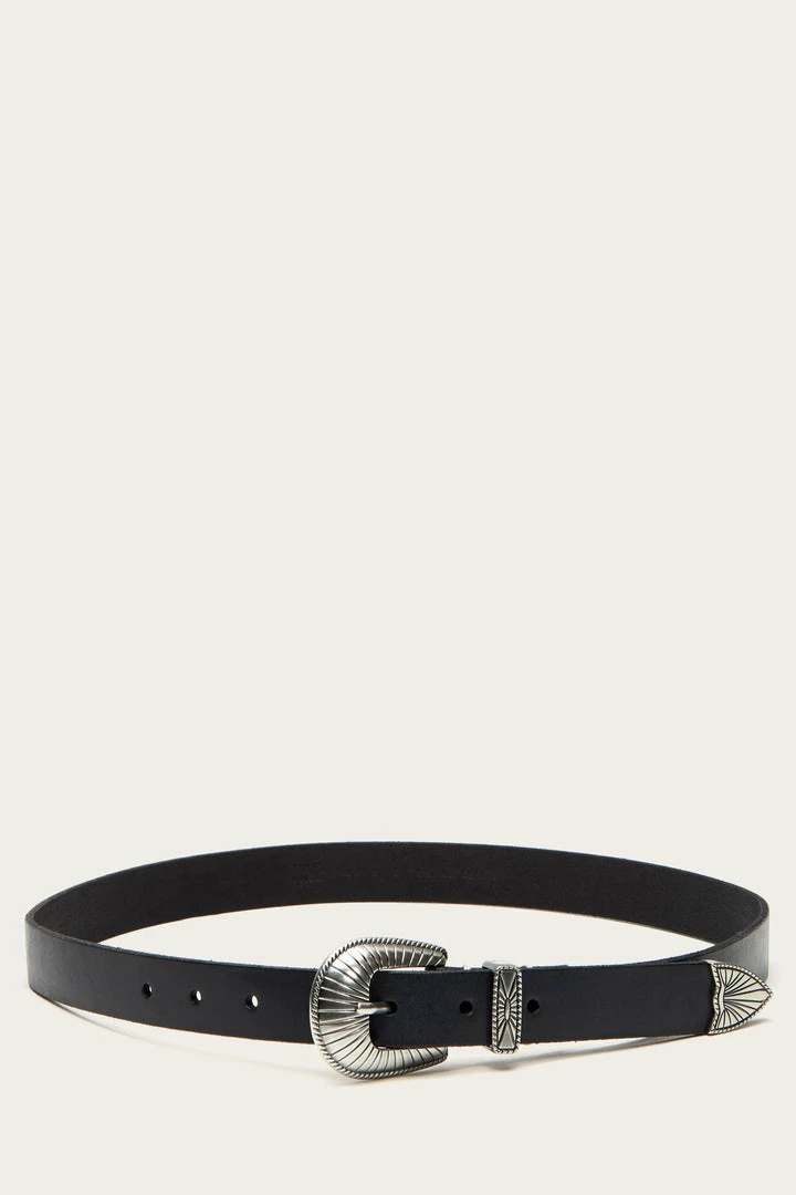 This 25mm wide belt is expertly shaped and polished, this slim style is decorated with an engraved Western-inspired three-piece silver buckle.