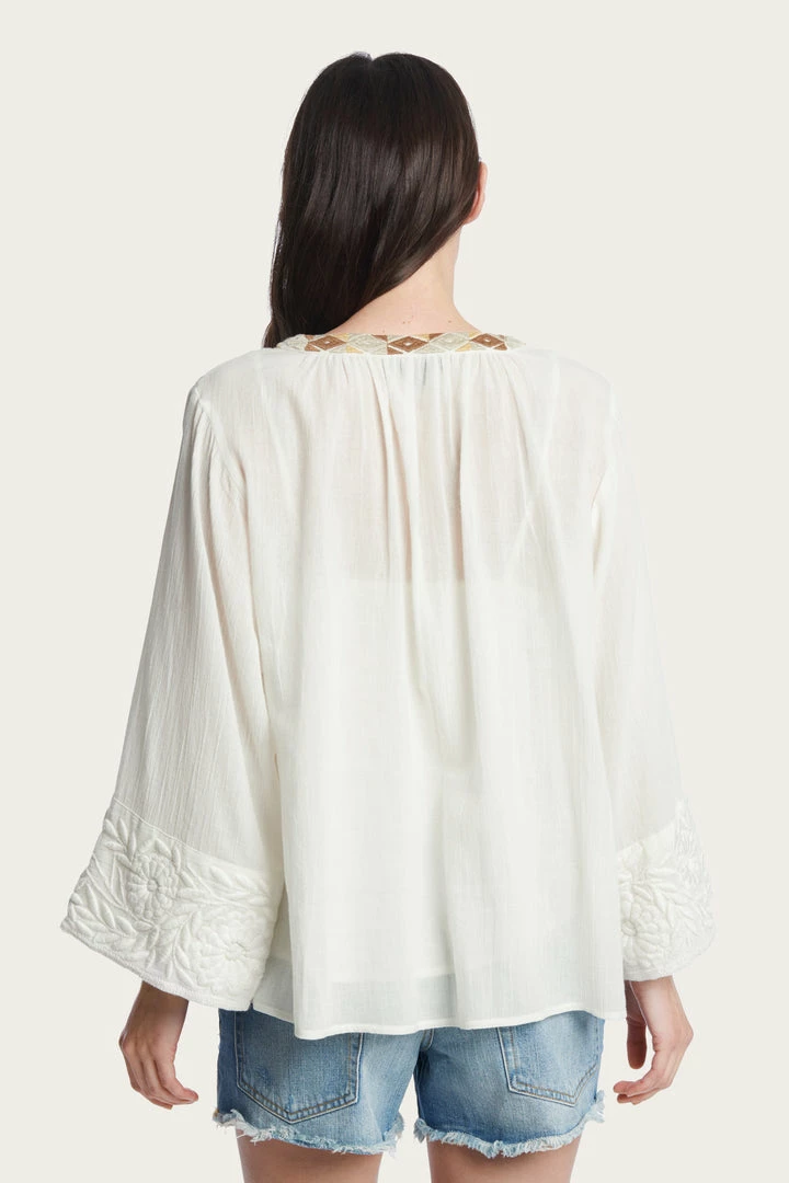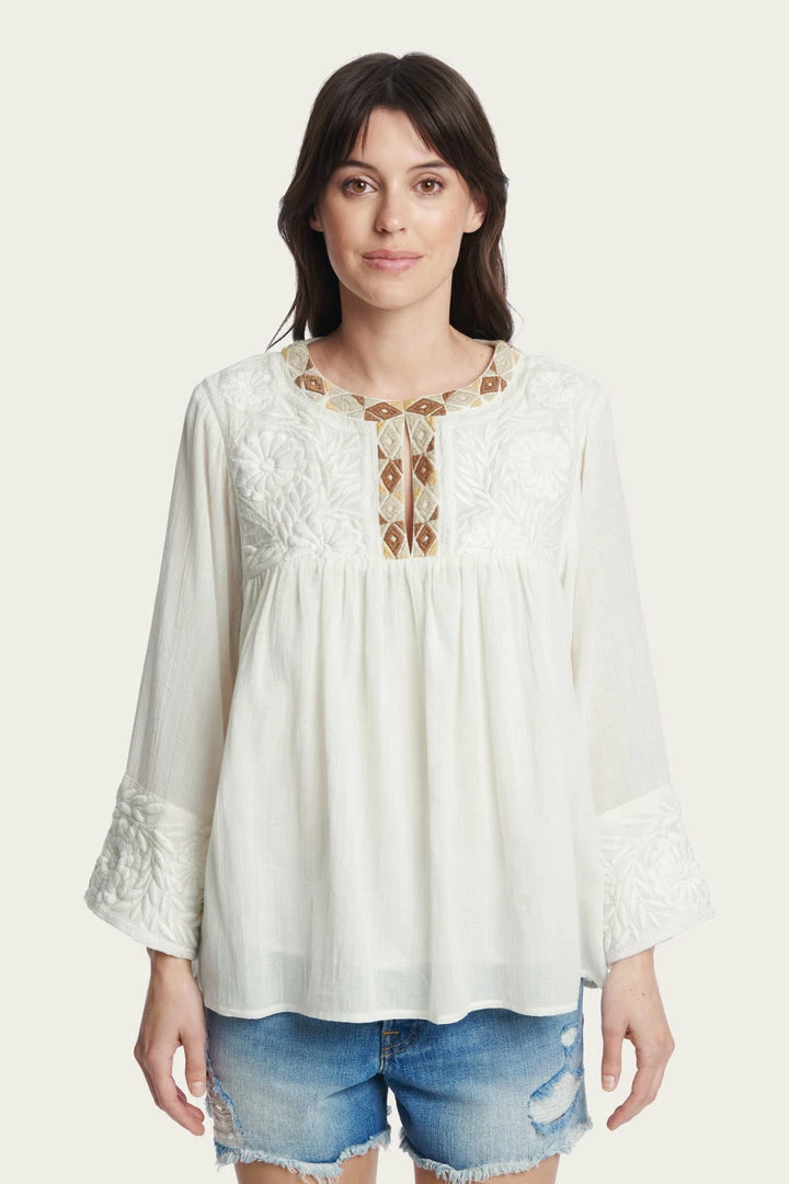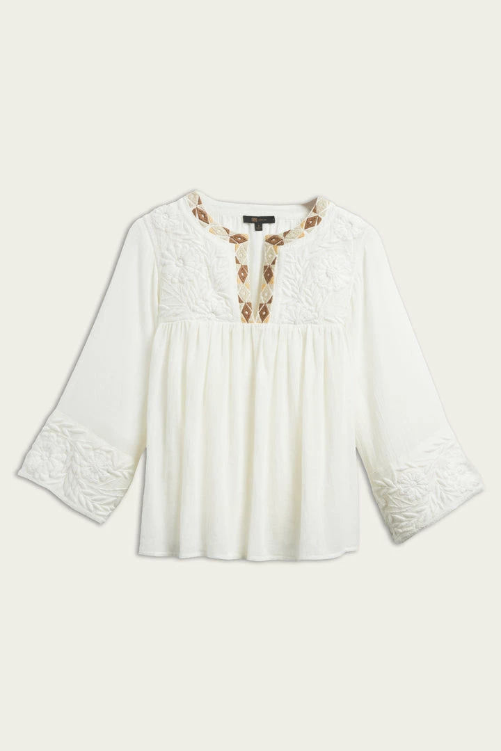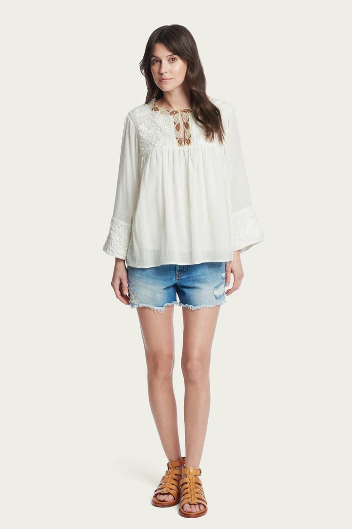 Cut from an airy fabric, this blouse is prettily embroidered at the split neckline. The bodice falls to pleats below the yoke and ensures a comfortable fit and adds to the folksy feel. Long sleeves.