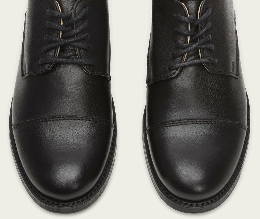Smooth oiled leather with vintage cap toe details.. Hand burnished at toe and heel.