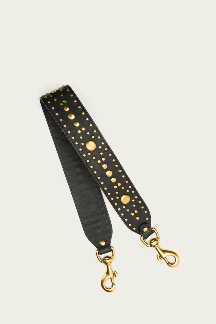 EXCLUSIVELY OURS. A statement in decorative edge. Handcrafted from smooth full grain Italian leather, this embellished handbag strap with a mix of multi-sized studs adds rebel cool to any look. – Antique brass hardware
