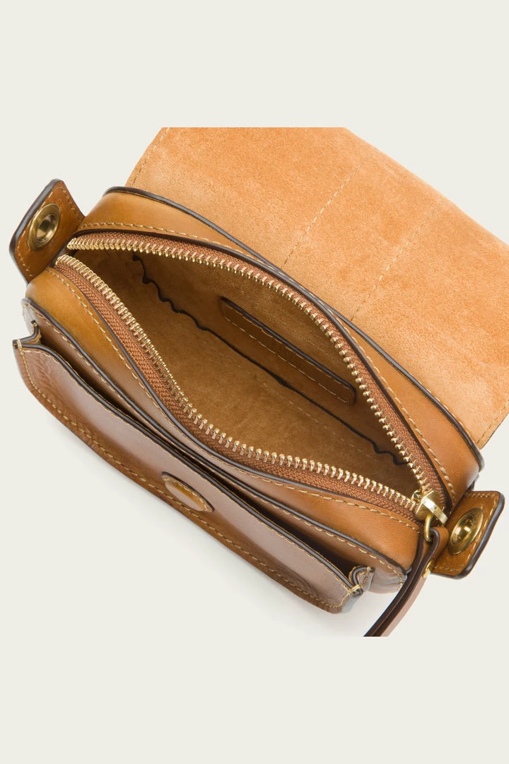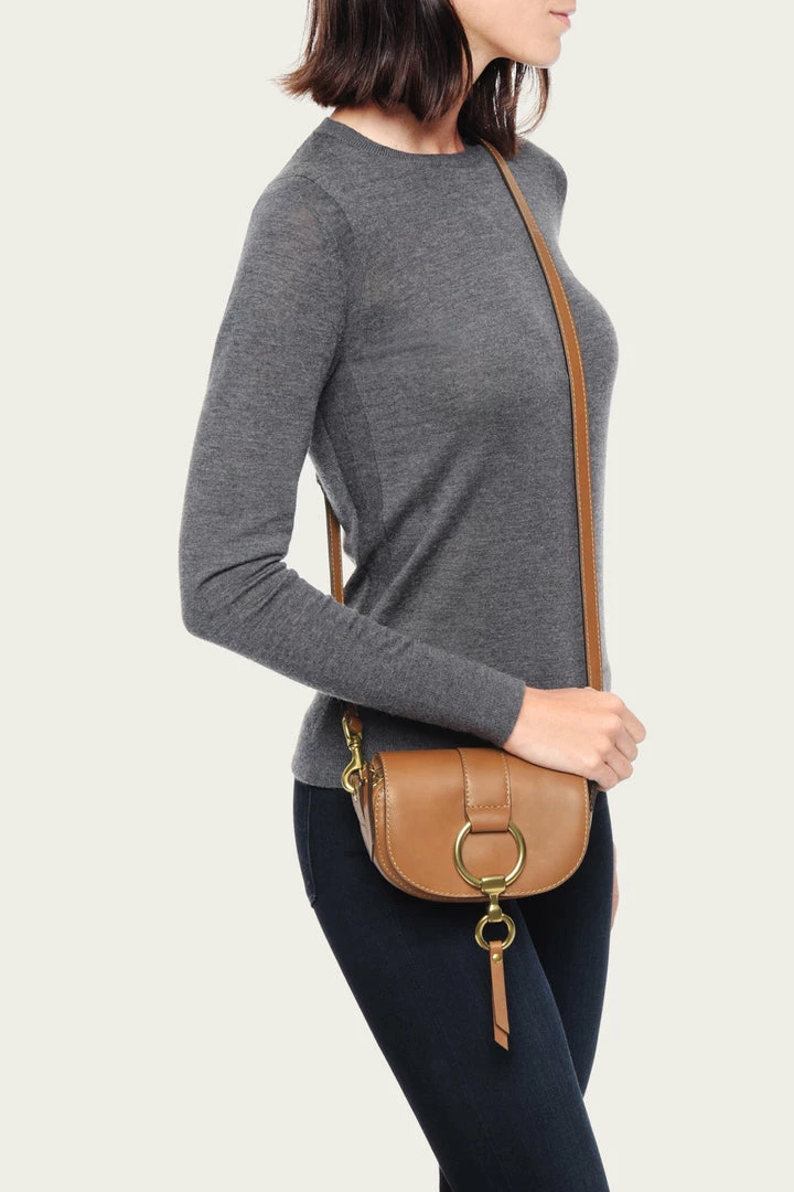 The Frye brand celebrates the natural texture of the antique vegetable tanned leather on this saddle shape inspired bag. This versatile piece is offset by signature 70’s vintage Frye equestrian-inspired double interlocking harness ring hardware at the flap front. The suede-lined interior is roomy enough. Carry yours by the detachable crossbody strap. Topline zipper closure. – Brass finish hardware