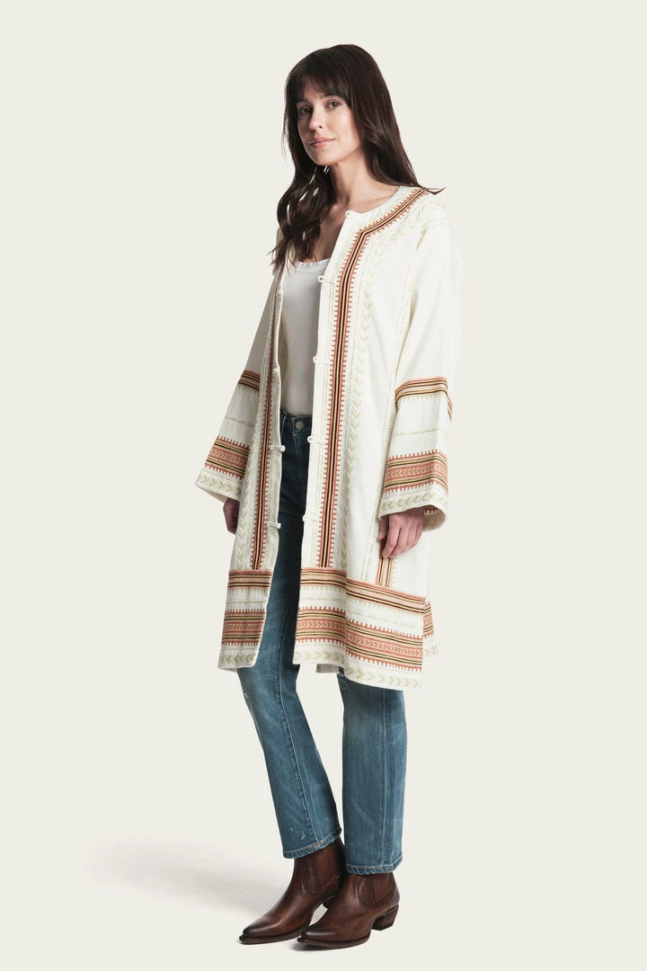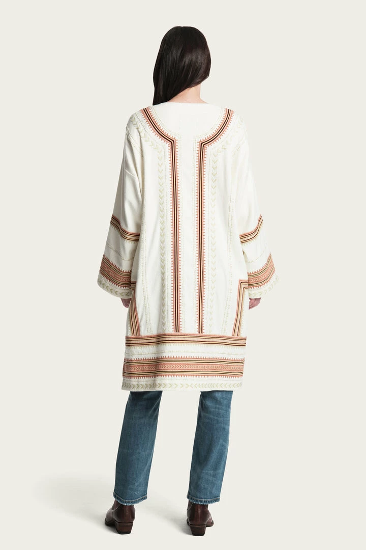 This robe is made from a cotton-blended weave with embroidered detailing at the frog closures and slit hem that floats beautifully as you move. – 70% cotton, 30% viscose