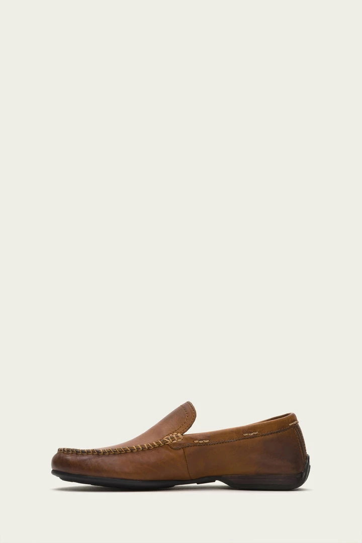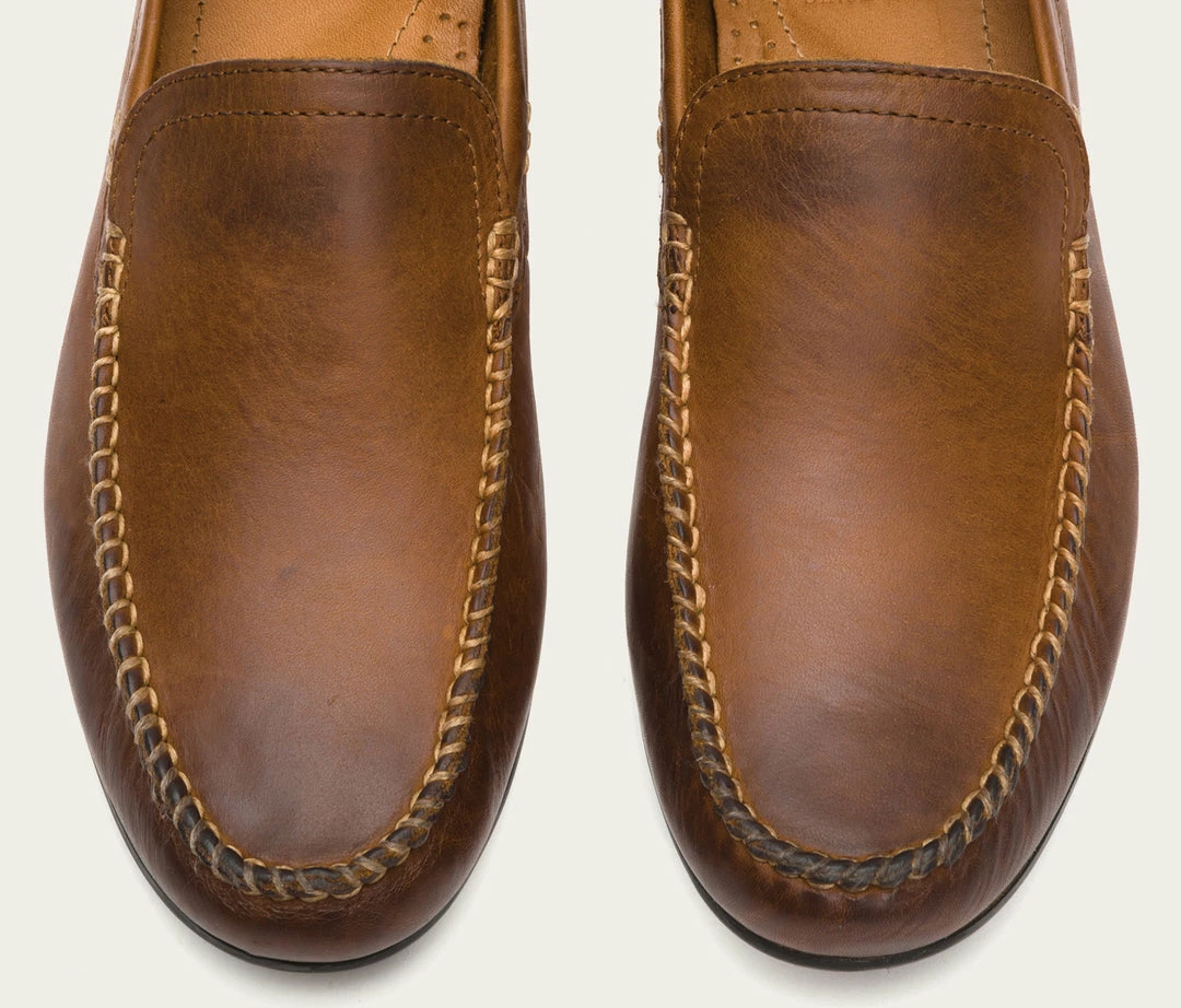 This slip-on merges the elegant and lightweight style of the classic Italian driving shoe with our signature craftsmanship. Made of well-oiled vintage leather that’s been hand burnished and accented with heavy stitching. The full rubber sole over a modified heel ensures this handsome slip-on holds its own, both on the race track and off.