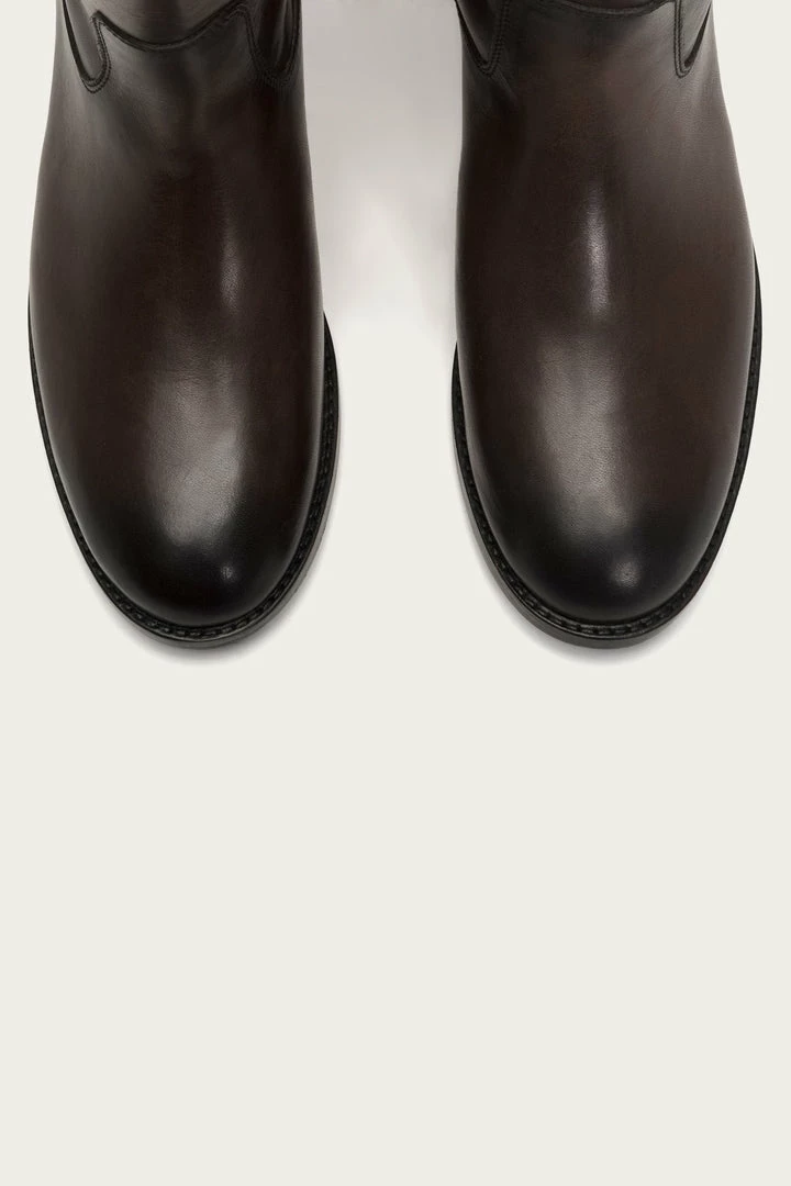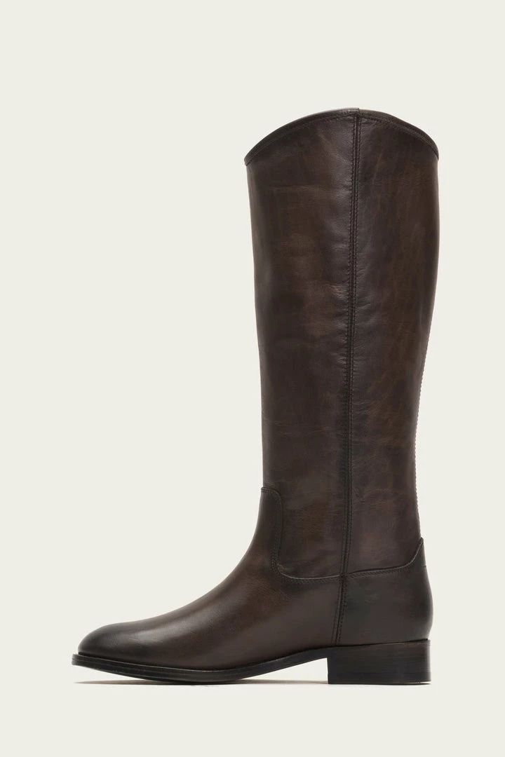 The Melissa equestrian-inspired tall boots are made from hard-wearing vintage leather in a pull-on design. Contoured through the ankle for support and the most flattering shape, they have a newly updated Frye signature button detail that sits just below the modernized topline providing a tailored look. Slight heel with leather soles.