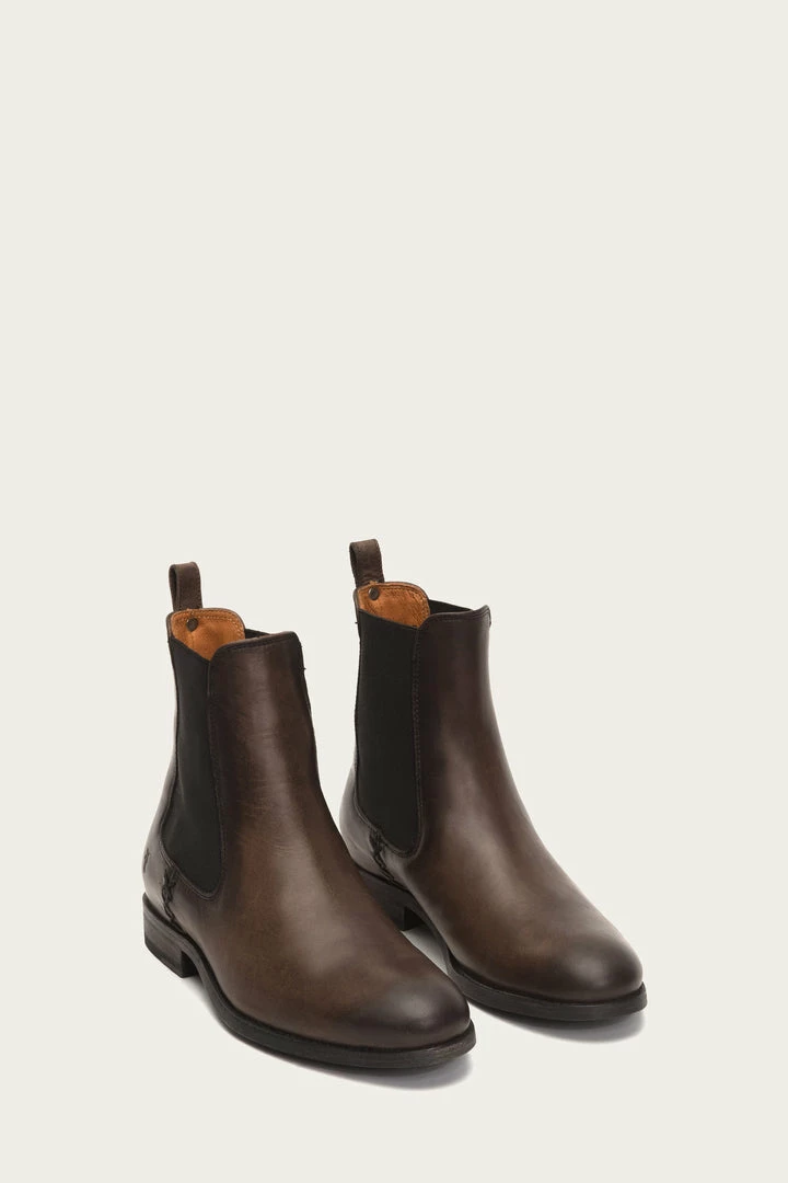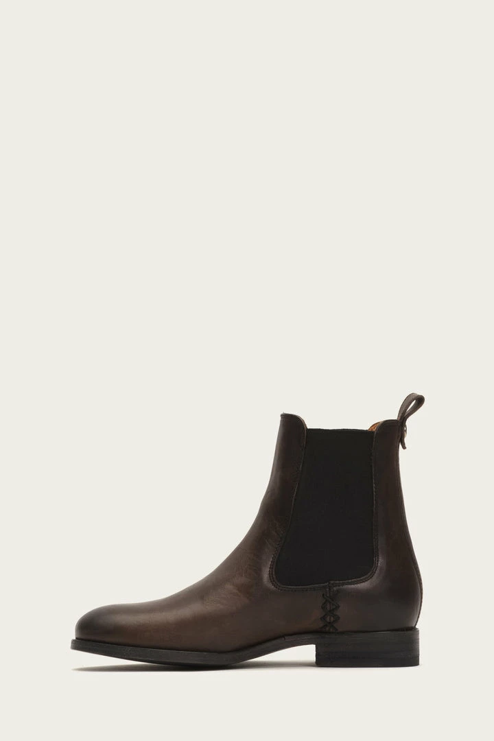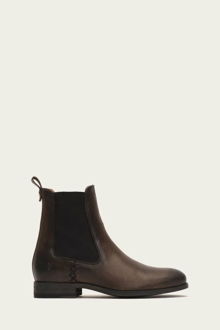 Classic Chelsea elasticized gores at sides lend a modern update to these booties made from antiqued pull-up washed leather. But leave no doubt they are built to last as is with all of Frye’s exceptional hand crafted designs. This pair is constructed with a durable low box spring and detailed with a signature Frye button at the back heel pull tab.