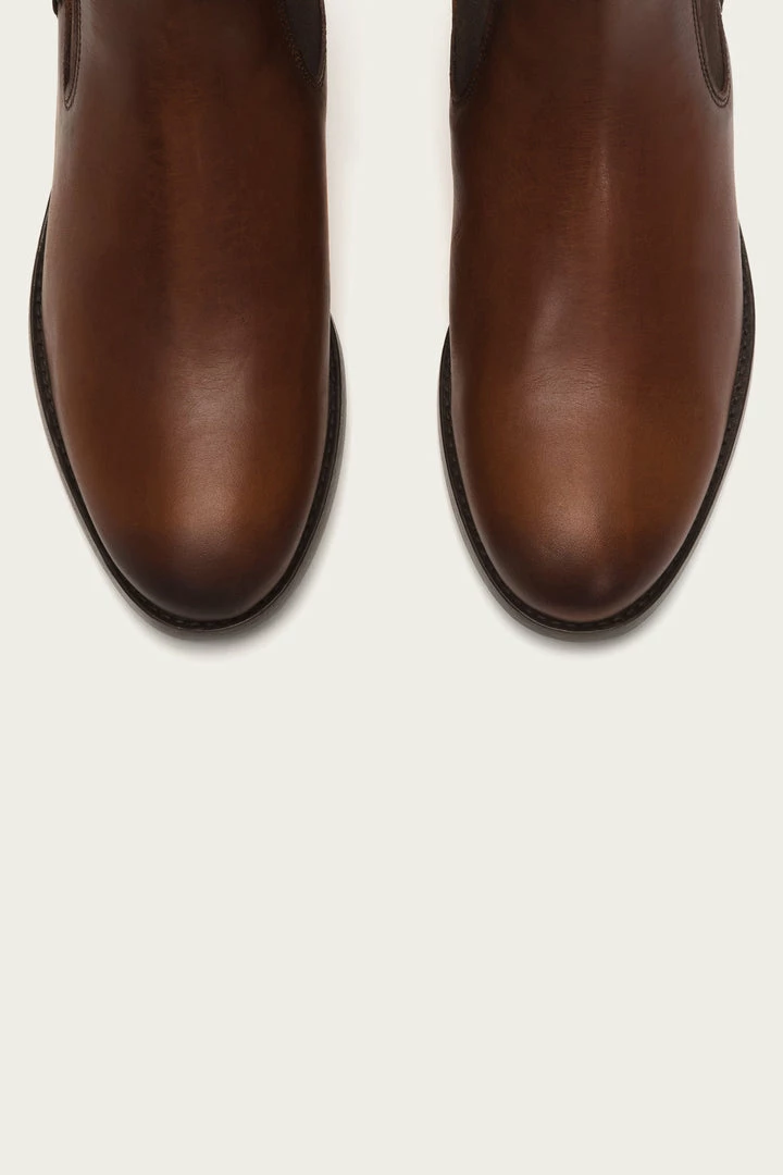 As the master of handcraftsmanship, these vintage Italian leather booties are built to last. They are constructed with a low box spring to lend the style a refined aesthetic with utmost durability. Signature Frye button detail at back heel pull tab. Classic Chelsea elasticized gores at sides.