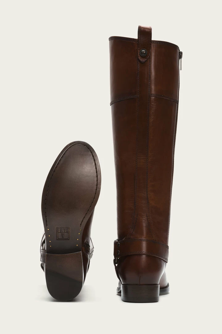 Sleek and utterly chic, this knee-high boot brings character and substance to your wardrobe. The elegant silhouette is constructed from smooth vintage leather using the same meticulous handiwork that has made Frye a legacy of craftsmanship. The signature harness wraps the ankle, while our signature Melissa button adorns the back pull tab. – Italian leather- Leather lined- Leather outsole- Full inside zip – 16 1/4″ shaft height- 14 1/2″ shaft circumference- 1″ heel height
