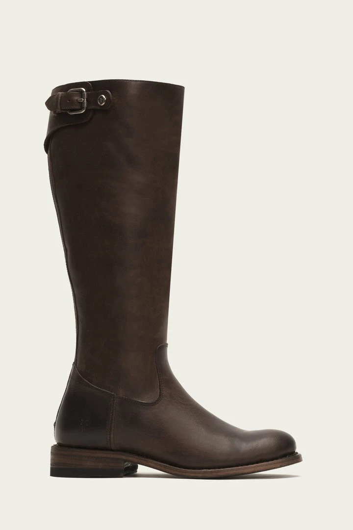 Hand-finished in Italy and made from an antique pull up washed leather, the Jayden boots are sophisticated and sleek. This round-toe pair hits the knee and has a low block heel with a full length back zipper closure. The ring buckle detail gives nod to Frye heritage however, it snaps on an off for stylish versatility. – Italian leather