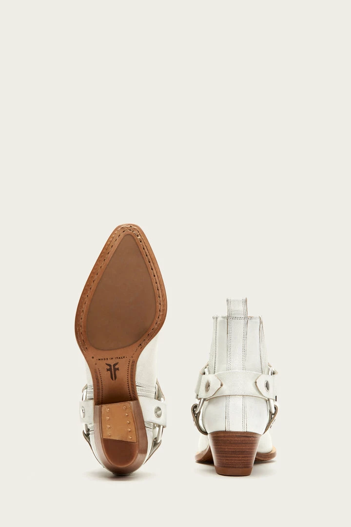 Rework a classic moto-inspired Chelsea bootie for the new season with slightly edgier details as we like to touch upon tough accents. This Italian-made distressed cow leather pair has a point-toe, tapered stacked leather heel and metal ring harness and rivet hardware strap. Finger gores at sides. Part of Our Made in Italy Collection.