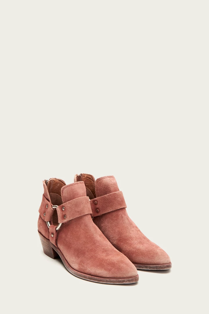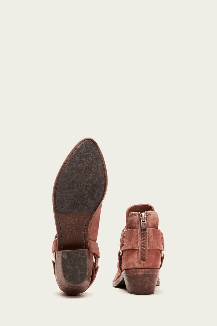 At the forefront of Frye craftsmanship are iconic details such as the signature ring harness strap and oiled suede. The asymmetric cutout topline hits just above the ankle and keeps the Western silhouette in focus. Zip closure at back. Padded footbed and rubber pods at outsoles keeps with comfortable traction. – Leather lined