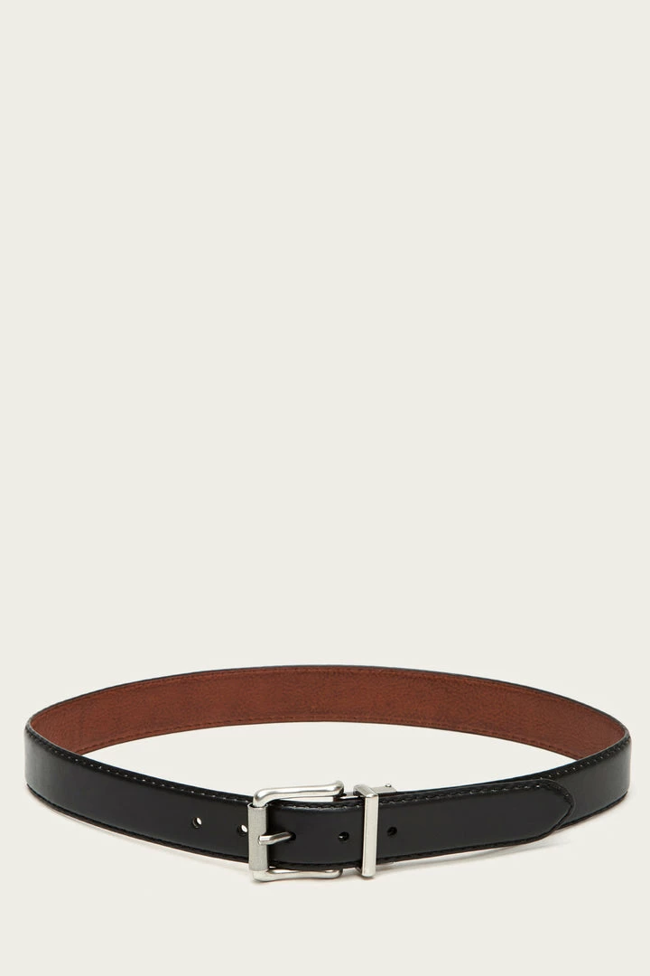 This reversible belt is crafted from smooth leather that will grow more supple with age. Finished with a sturdy buckle, it is subtly pressed at the edge for a flavorful fit. Heavy stitching adds more definition.