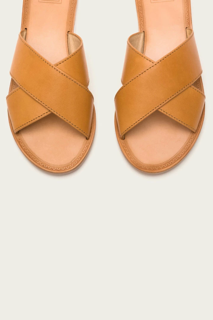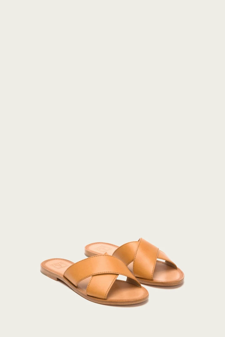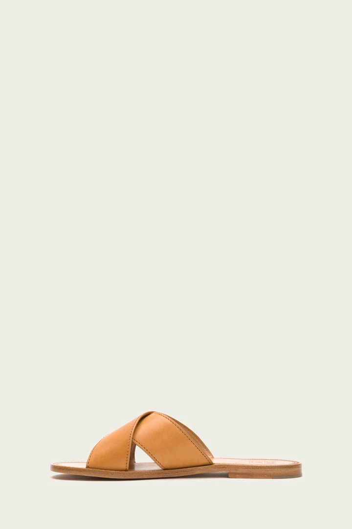 Simply perfect. Frye’s signature craftsmanship brings an artisanal edge to this easygoing, flat sandal. Made of smooth full grain leather, this shoe features two thick straps criss-crossed for the simplest, most elegant of designs, finished off with a sleek leather sole and the subtlest of heels. – Italian leather- Leather lined- Leather outsole- 1/2″ heel height- Stacked leather heel