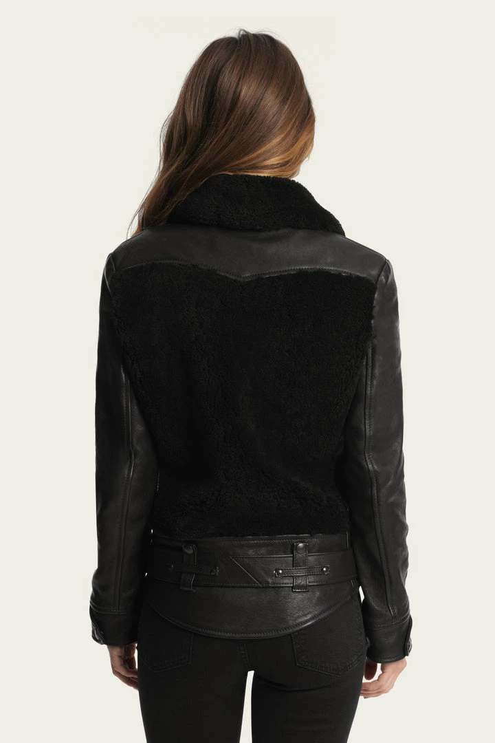 This Grizzly jacket based on an archival Frye heritage piece. It’s been made in the USA from a vintage oiled lambskin leather and trimmed with fluffy shearling that combines the best features of a biker with the cozy feel of a more substantial coat. It features a removable belt with a Frye double O-ring buckle closure and logo detailed snap button right sleeve cuff closure detail. Lined in satin so it will easily slip on. – Made in USA sourced from domestic and imported products