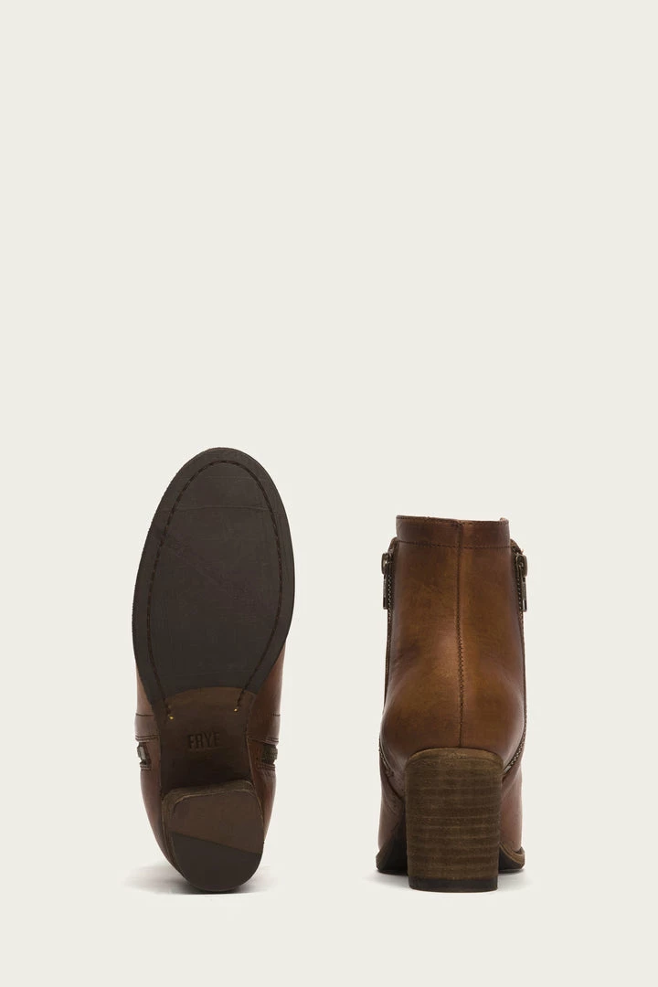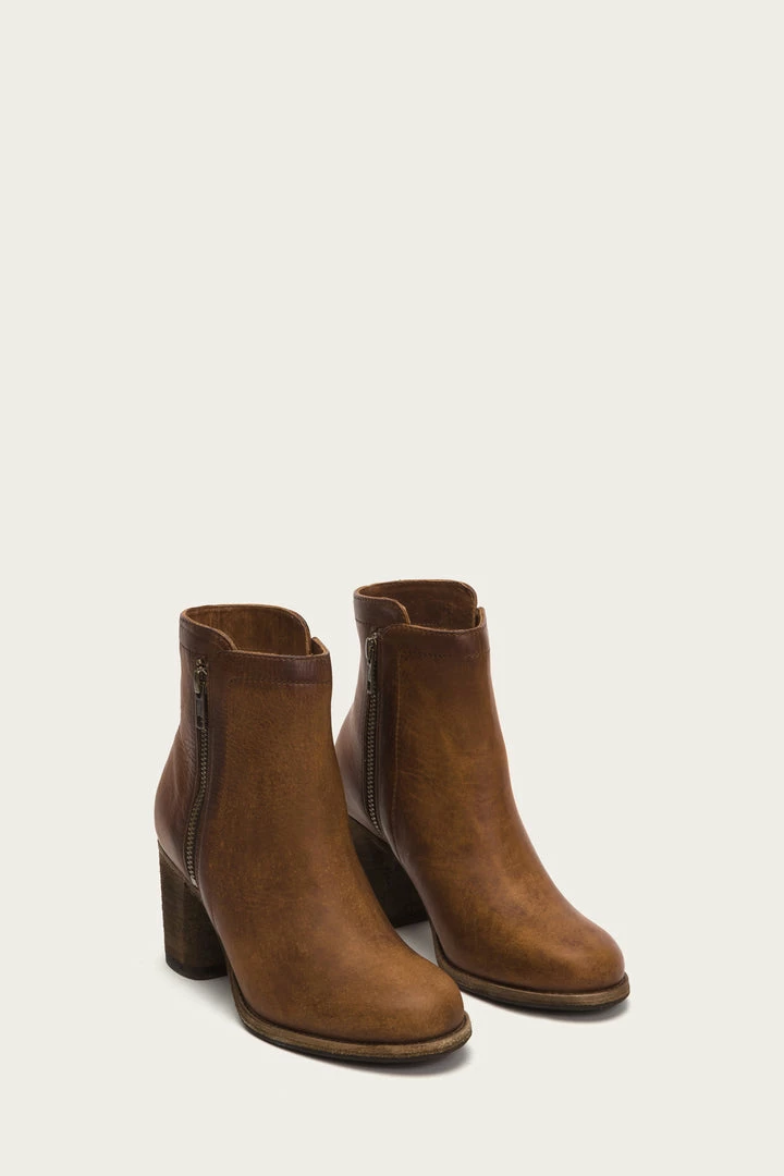 Effortless moto style. Handcrafted from washed oiled vintage leather for an imperfectly unique, new-antique look, this bootie offers a comfortable mid heel and round-toe silhouette that lend a casual touch to the irresistible cool of its double-zip design. – Italian leather