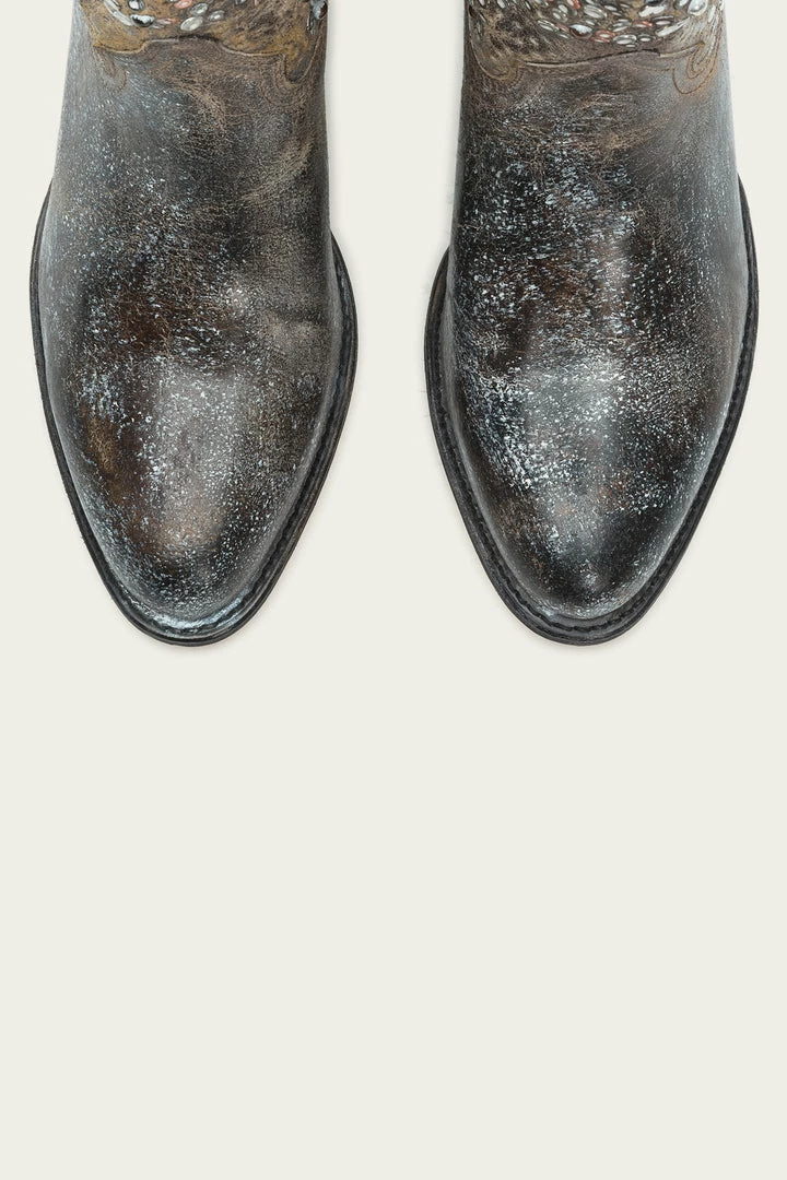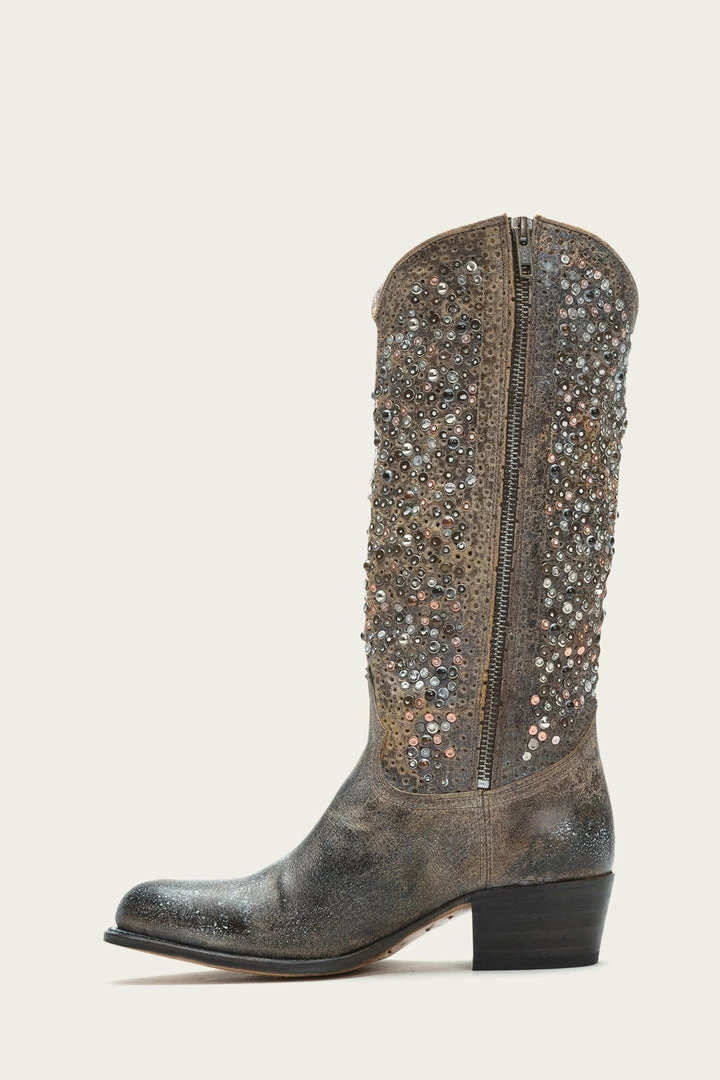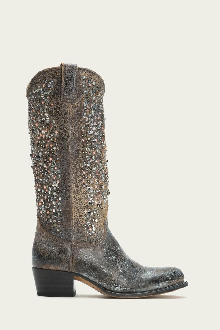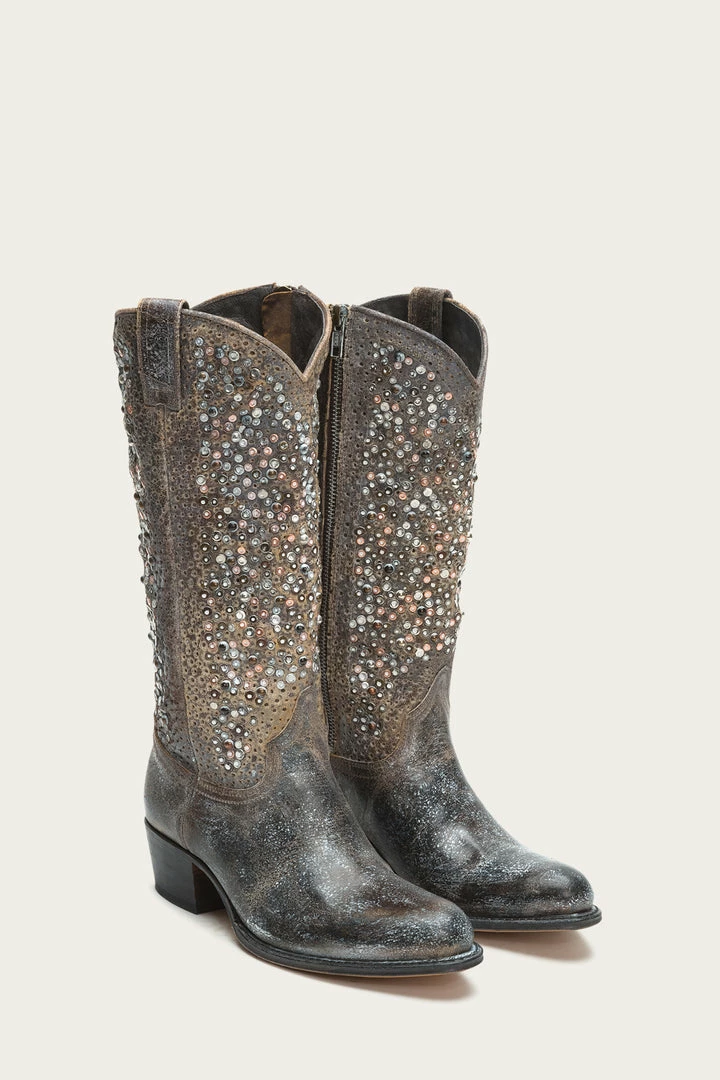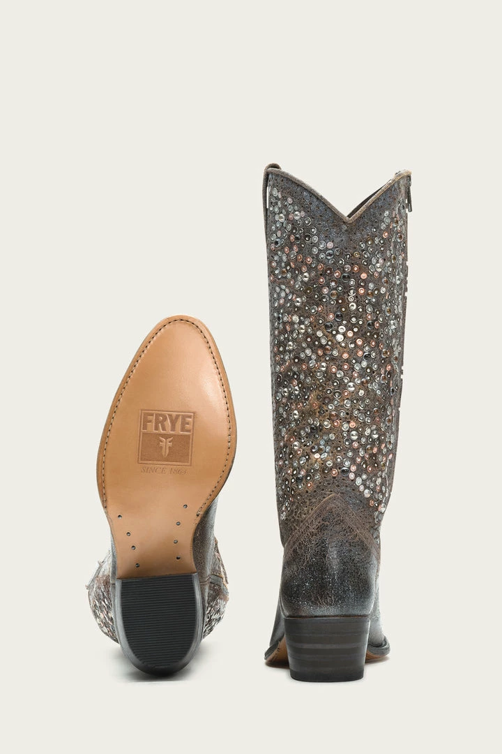 With great boots comes great responsibility – don’t walk near busy streets with these traffic-stoppers. The Deborah Studded Tall is the very definition of a statement piece, dropping jaws and velvet ropes in its path. The tall shaft is encrusted with tri-colored metal studs over distressed and perforated full grain leather. – Made in Spain