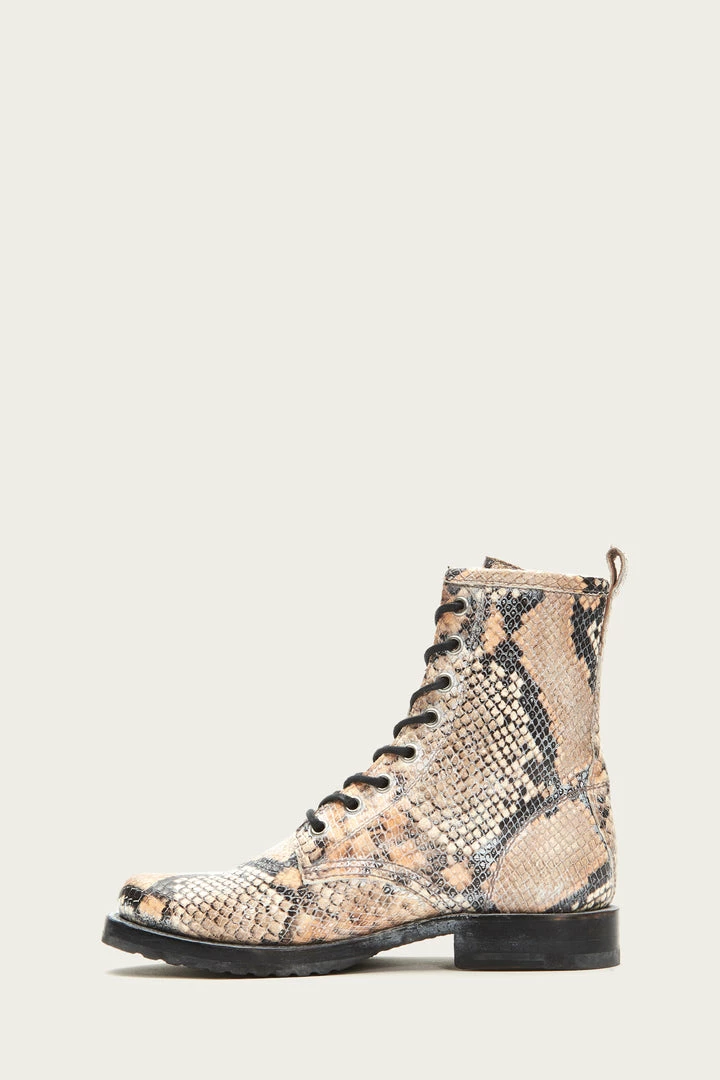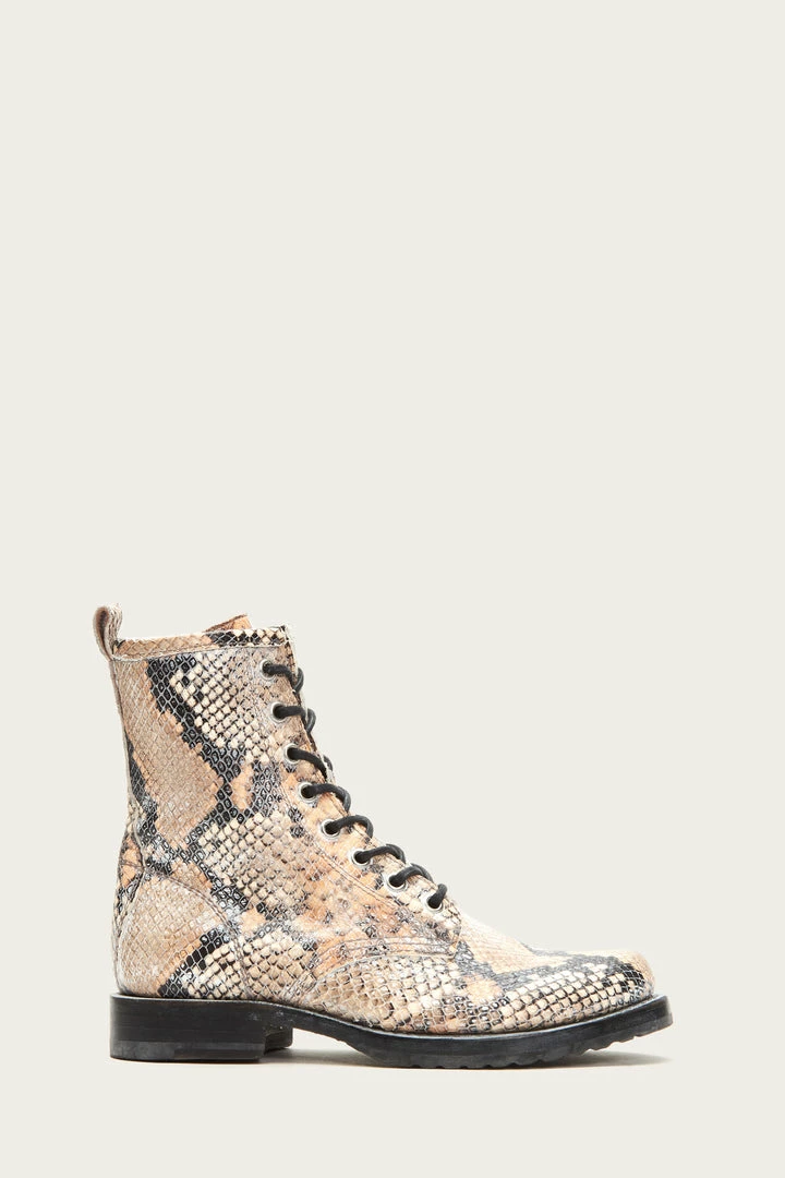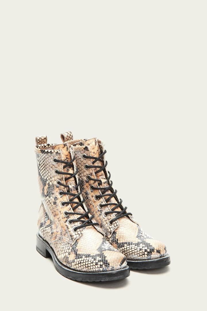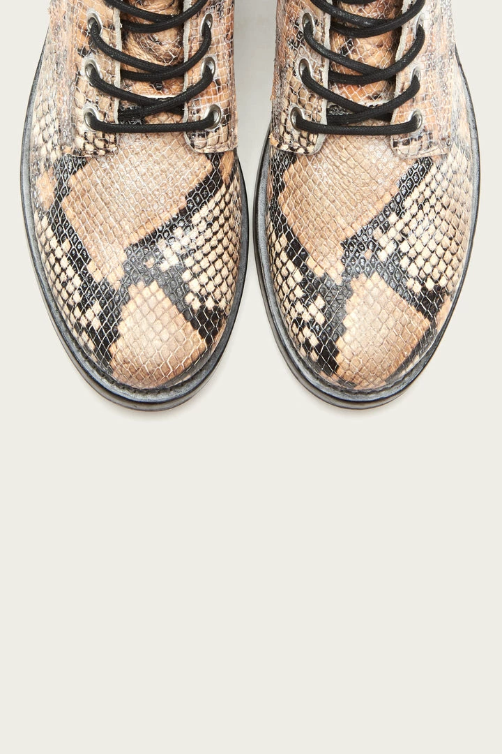 This leather Veronica combat version has a snake print for a modern take on a look you love, yet stays true to the streamlined and durable Goodyear welted silhouette. Lace-up closures.