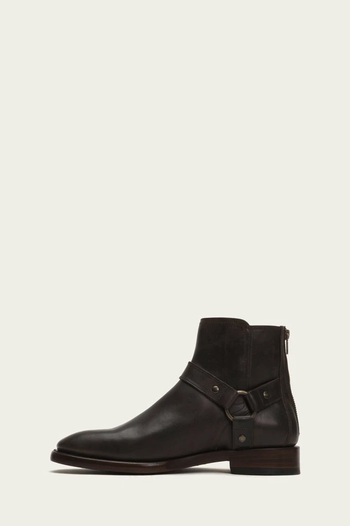 A clean-cut classic with Harness styling. Embellished with our distinctive studs and ring, a chiseled snub toe and polished leather outsoles, this back-zip dress boot in heavily oiled and vegetable tanned full grain Italian leather is refined yet always ready for adventure. – Leather lined