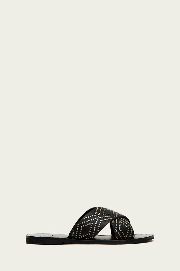 The ‘Ally’ slides are one of the Frye’s most popular styles because they’re incredibly comfortable, and they look so chic too. Made from smooth vintage leather, they have a round open toe and deco studs hand applied at the entirety of the crossover straps. The heritage stamp is placed on the sole.