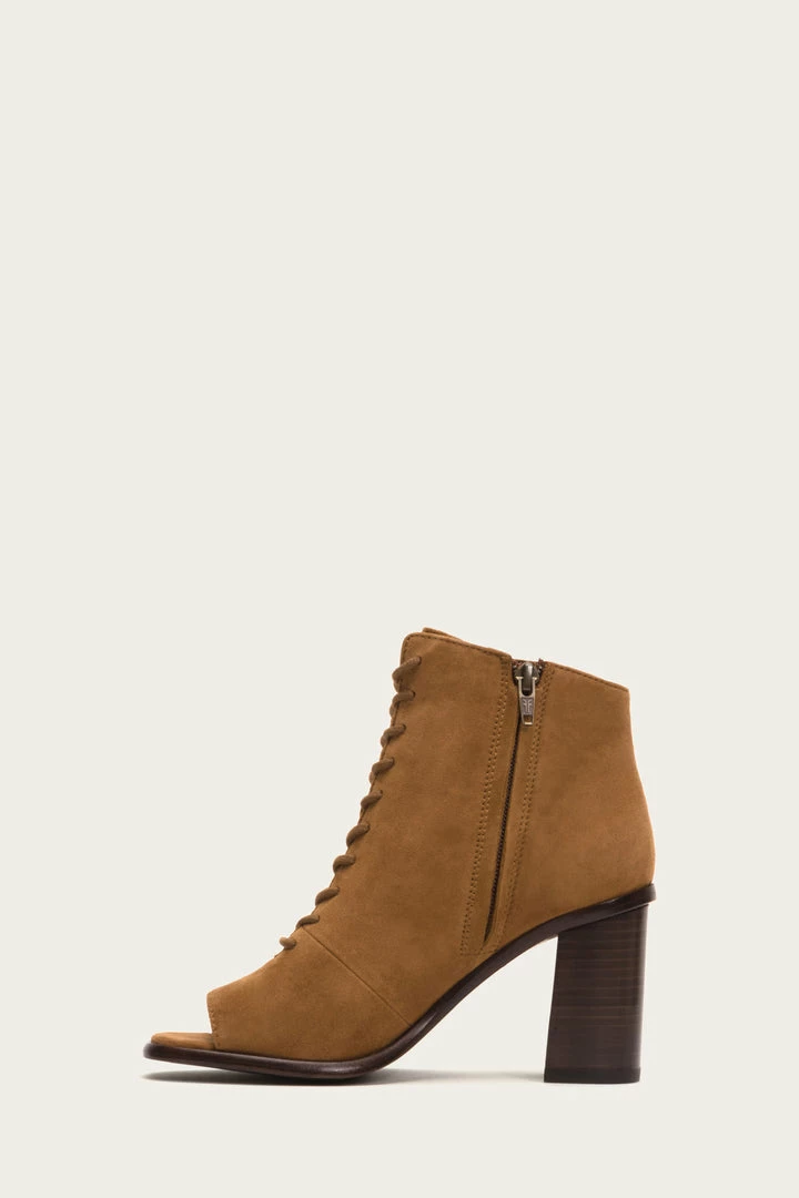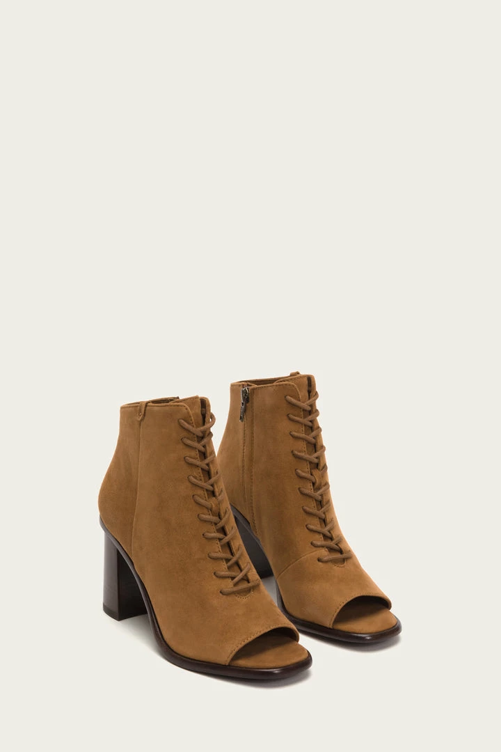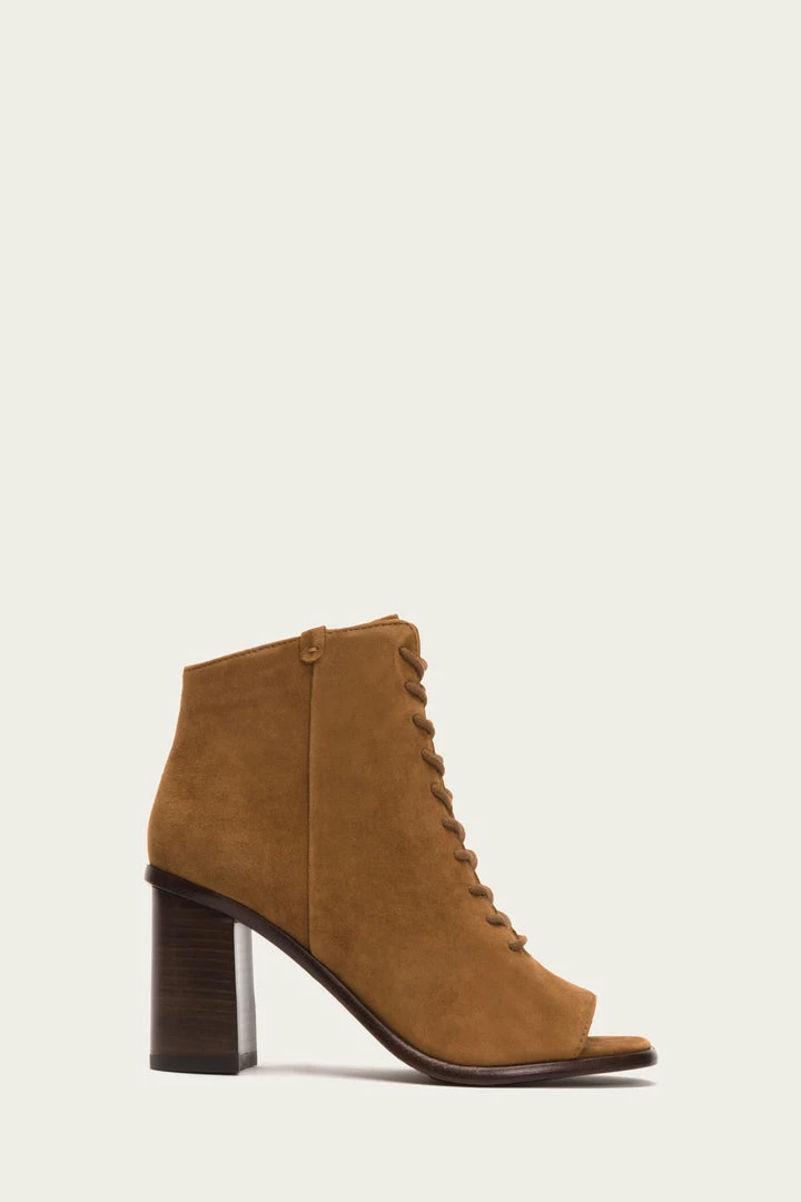 The lace-up with trans-seasonal style. An open-toe profile makes this mid-heel dress bootie with inside zip warm-weather ready. Soft kid suede lends refined elegance to any outfit. – Leather lined