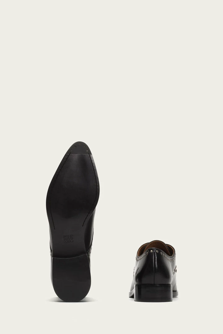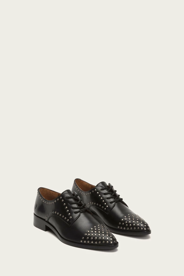 These soft vegetable calf leather brogues are outlined with hand-applied studs at the point-toe making for a perfect balance of edgy and chic. Lace-up. Slight heel. – Italian leather