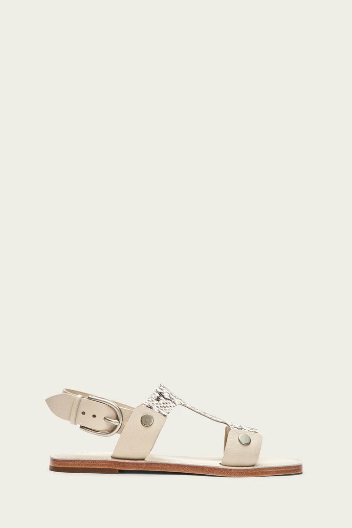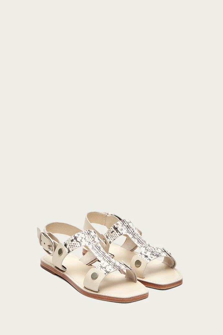 The modern sandal with Western sensibility. Handmade from polished, full grain and snakeskin-printed leather, this style stands out with its t-strap design, distinctive square toe and studded detailing. Set on a textured leather outsole, the sandal features ultra-comfortable suede lining and padded leather footbeds for all-day support. Finished off with an antiqued metal buckle and hidden gore for ease of fit.– Leather lined