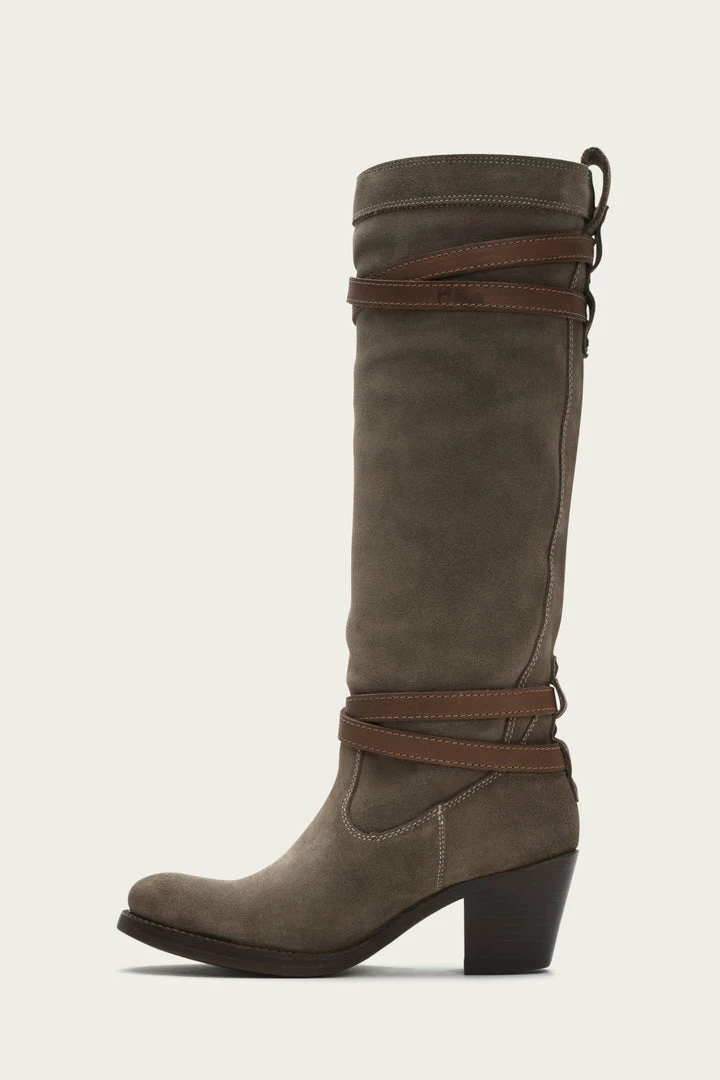 Oiled suede wrapped with smooth leather straps around the top and the ankle for top-to-bottom luxury. Chic and sturdy, the Jane Strappy is the perfect heritage-inspired tall boot. Frye’s signature hand burnishing brings out the richness of the color ways, giving an added depth. – Leather lined- Leather outsole- 14 1/2″ shaft height- 14″ shaft circumference- 2 1/2″ heel height