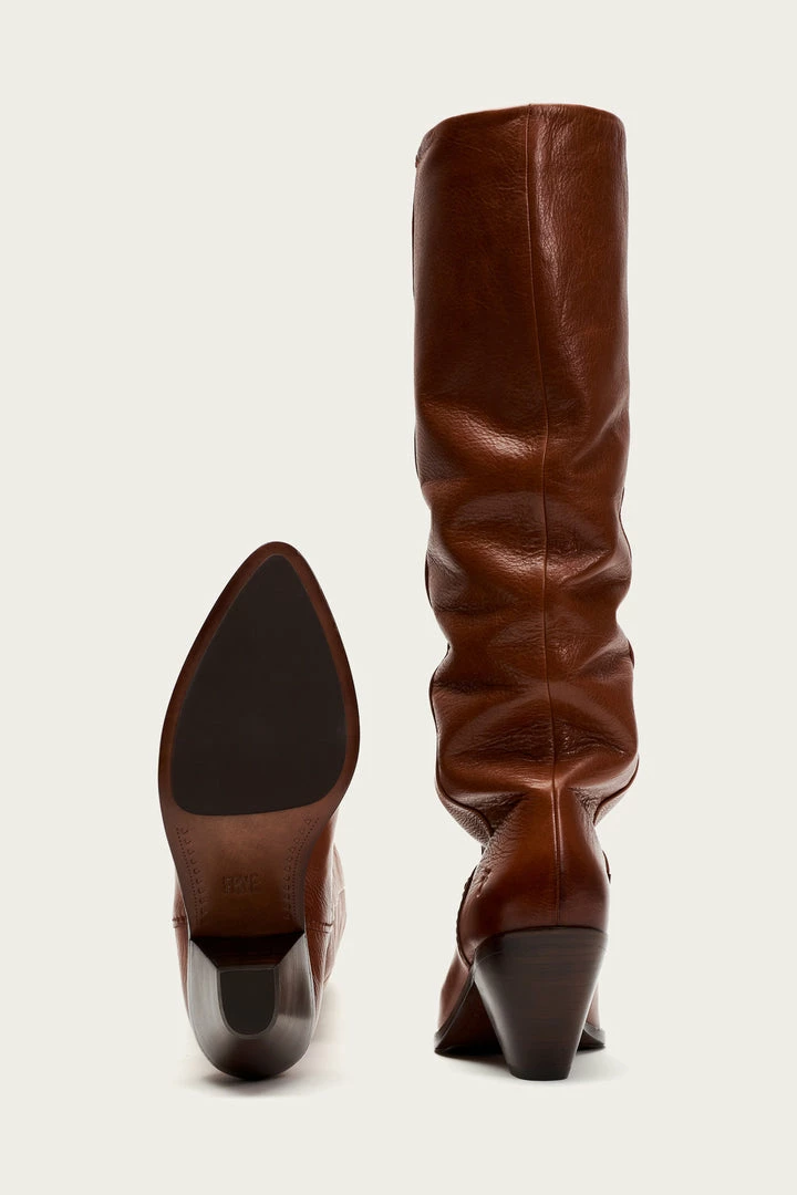 Slouchy knee boots have been on the radar as they provide an effortless updated modern look to a favorite 80’s pop culture fashion nod. ‘Lila’ has been made from supple full grain Italian leather and set on a conical heel with a well-articulated three-point Western Wellington detail.