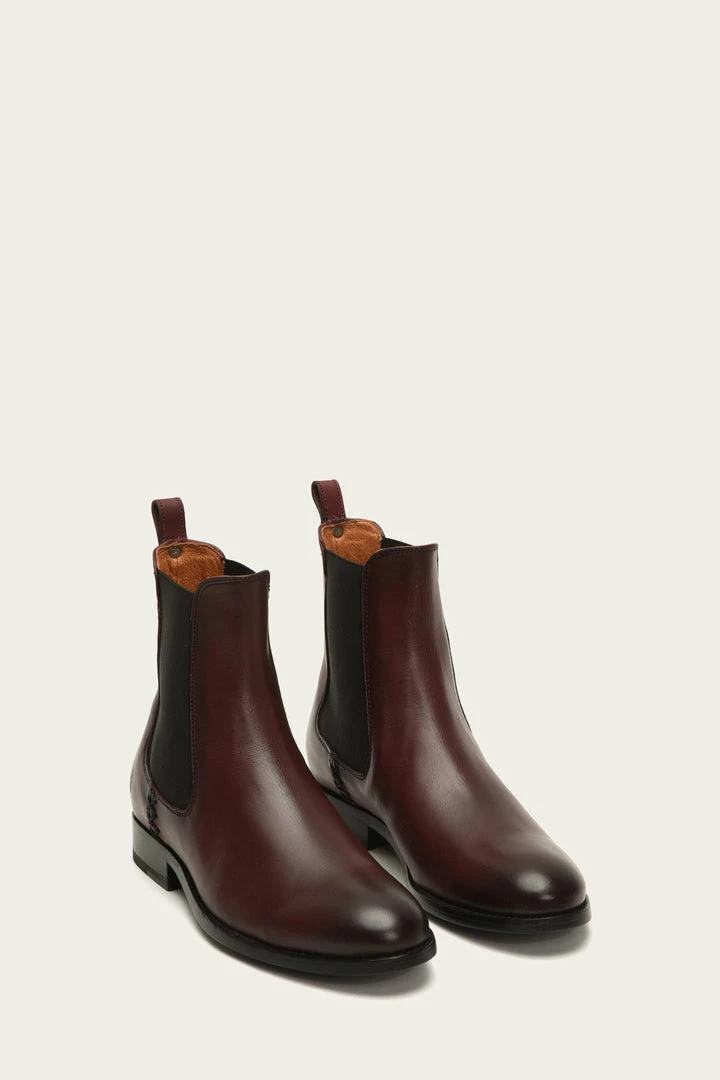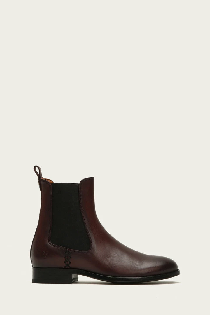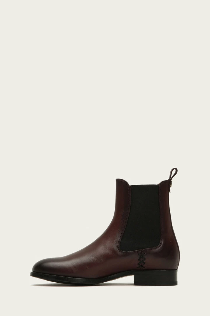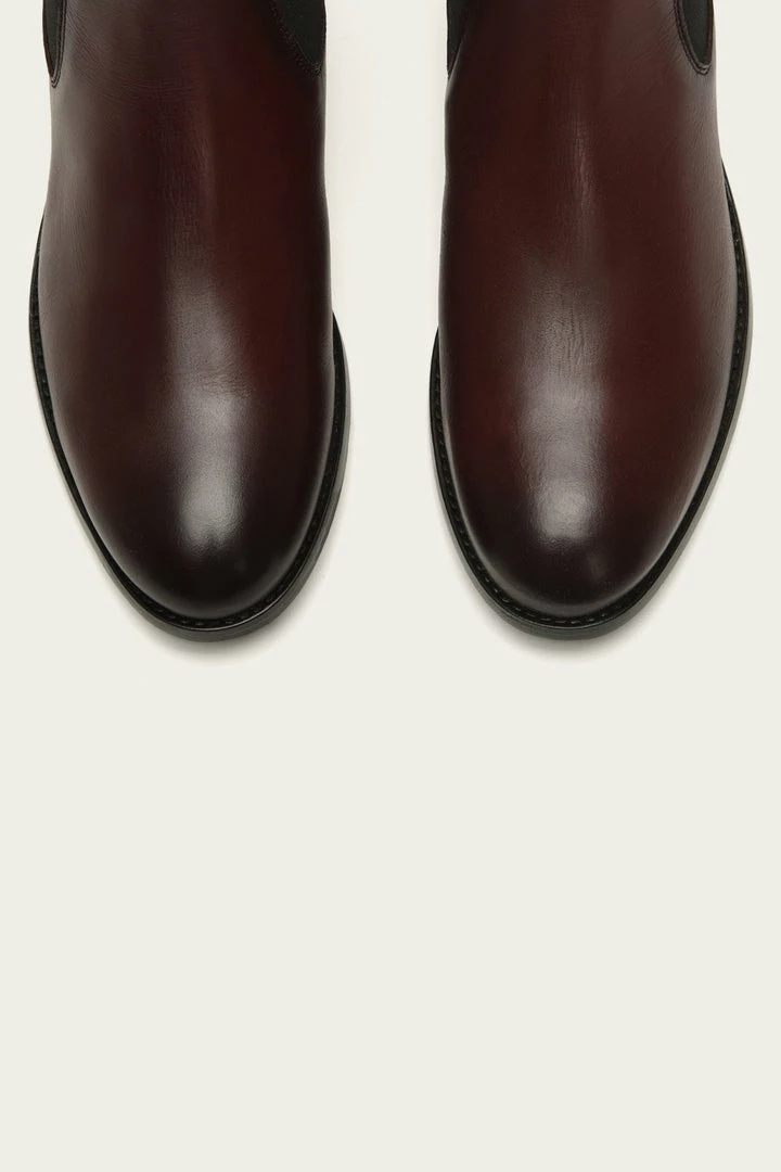These soft vegetable Italian calf leather Chelsea booties are built to last as they are constructed with a low box spring to give them a more refined aesthetic with utmost durability. Signature Frye button detail at back heel pull tab. Elasticized gores at sides.