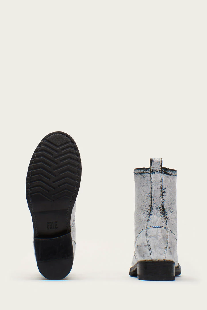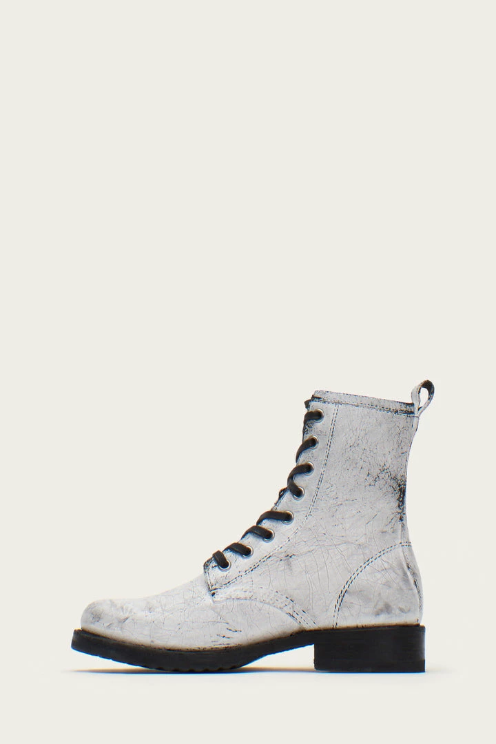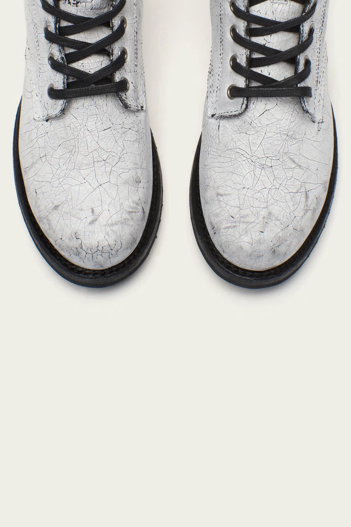 This rebellious pair of boots is fashioned from soft full grain leather that has been painted white and tire tumbled to create a distressed look. The crackled finish will wear down over time, giving the pair a unique, rock ‘n’ roll look. Built for the carefree girl with a streamlined silhouette and perfect fit. No leather care required.