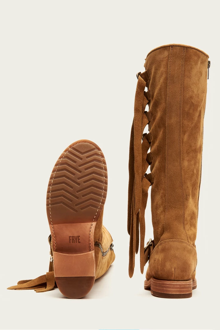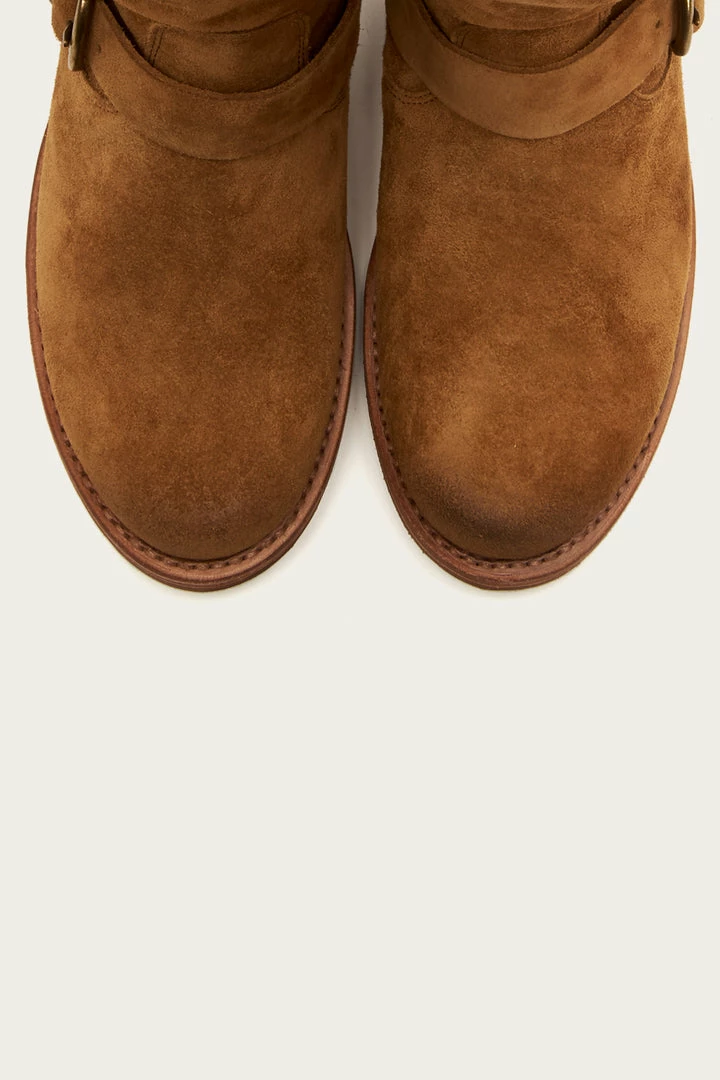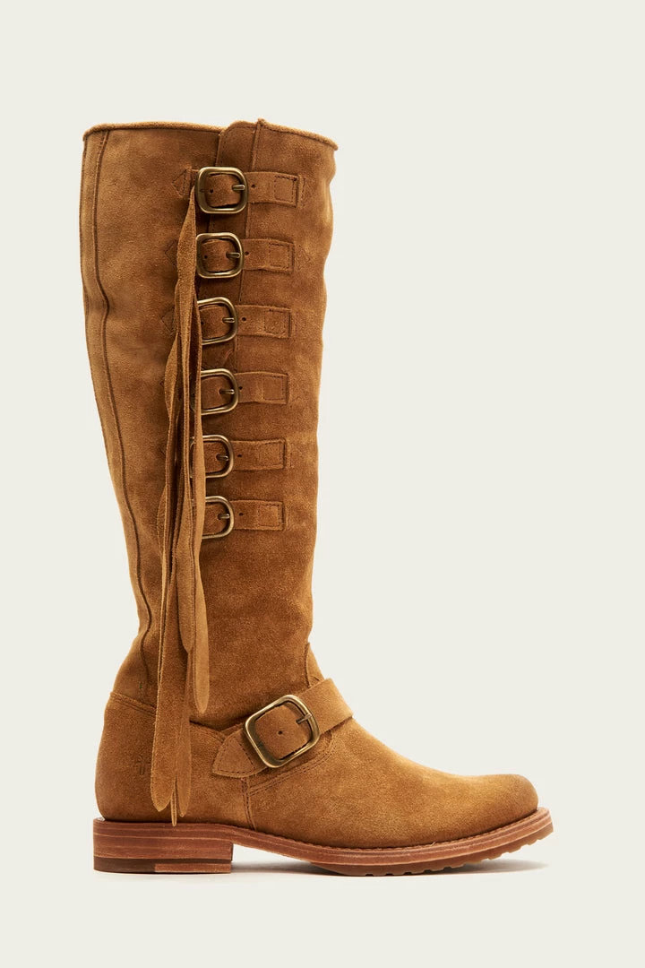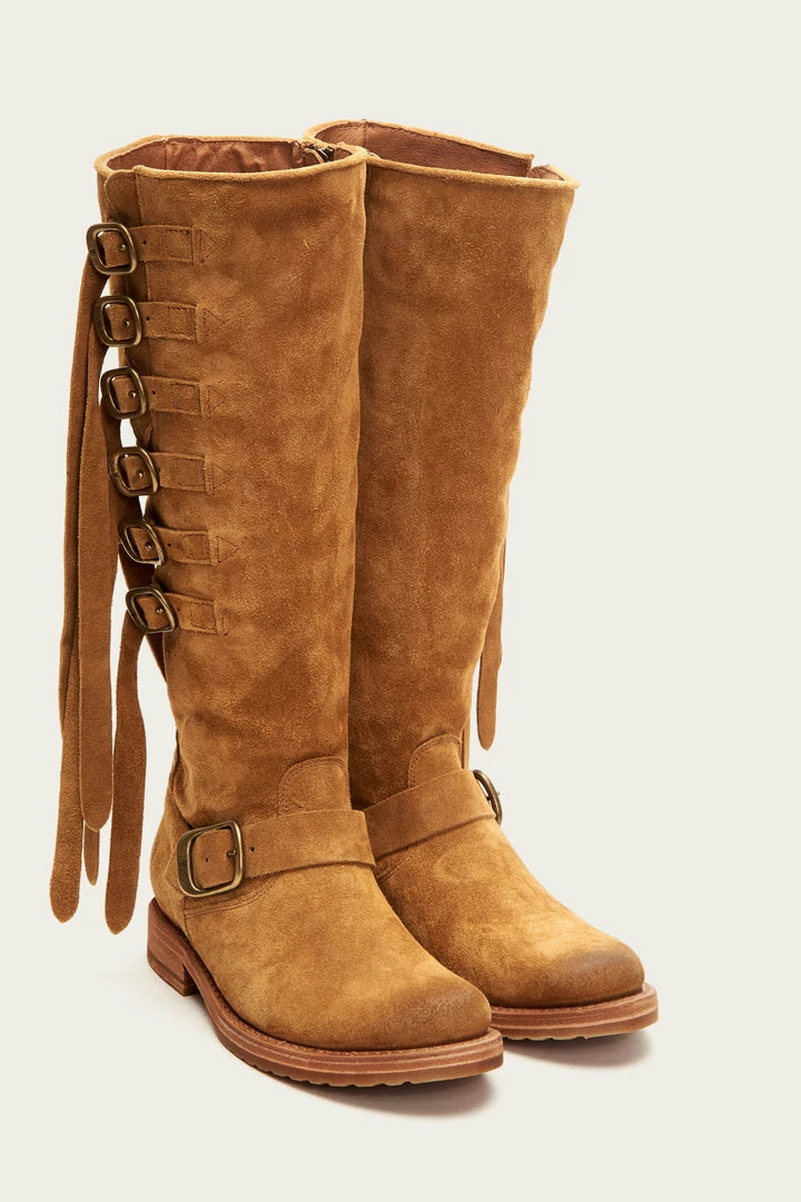 Frye’s Veronica boots are crafted from oiled suede in a tall silhouette inspired by classic biker styles. This pair is detailed with multiple extra long moto buckled straps that begin at the vamp and work their way up the shaft. – Leather lined